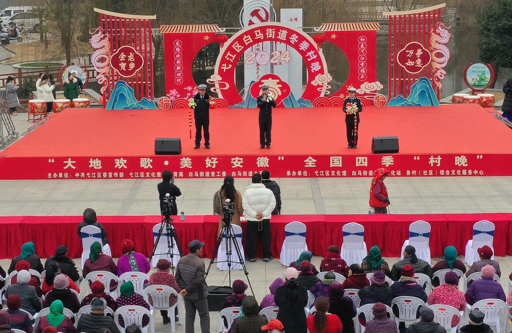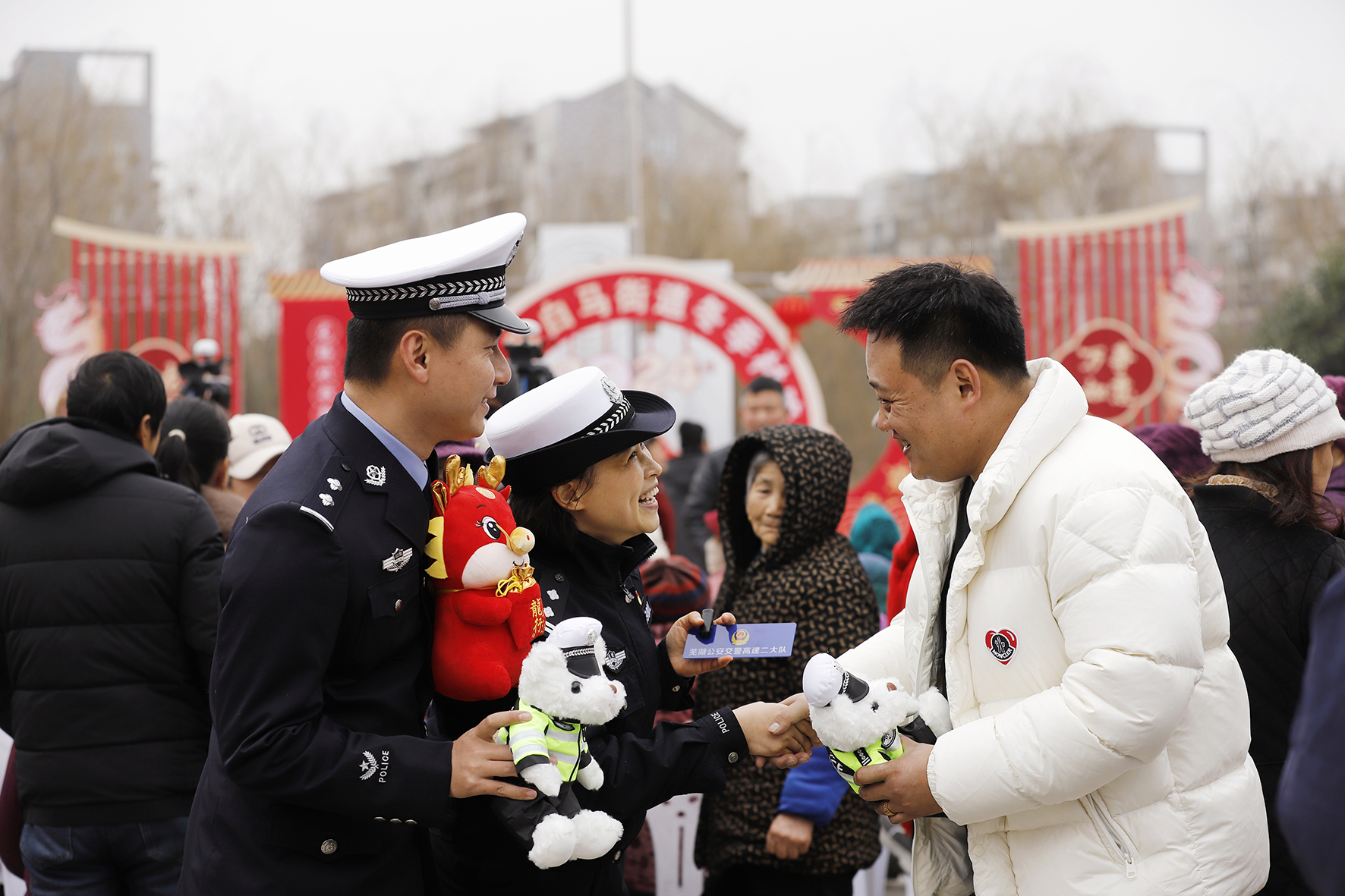 1月17日,安徽省蕪湖市公安局交警支隊(duì)高速二大隊(duì)民警走進(jìn)弋江區(qū)白馬街道冬季“村晚”現(xiàn)場(chǎng),通過(guò)“交通知識(shí)你來(lái)答‘熊熊’‘火火’過(guò)大年”活動(dòng),向廣大群眾宣傳“一盔一帶”、高速公路安全行車(chē)等交通安全知識(shí),共迎“春運(yùn)”,共祝平安。