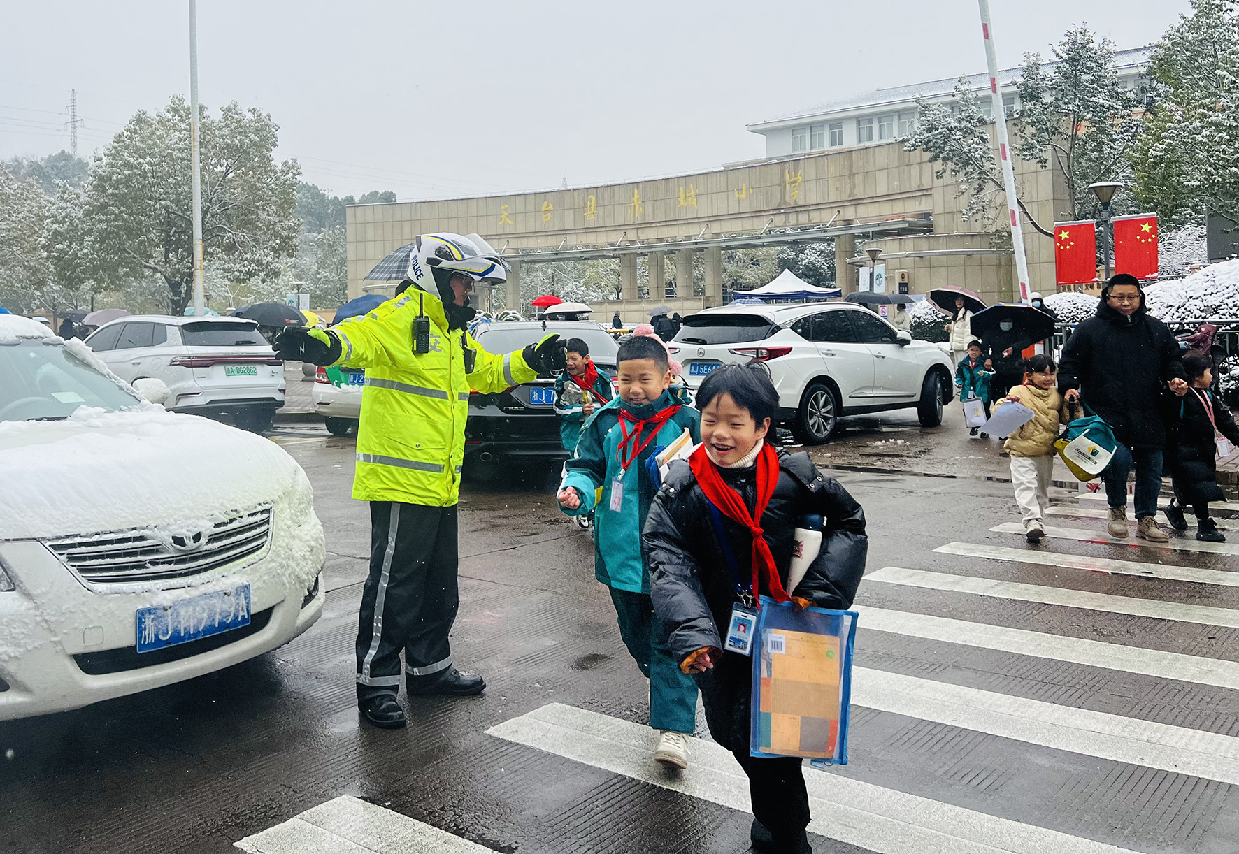 1月22日,浙江省臺(tái)州市天臺(tái)縣城區(qū)迎來入冬后首場降雪。天臺(tái)縣公安局交通警察大隊(duì)迅速開啟“護(hù)學(xué)模式”,增派護(hù)學(xué)崗警力,全力疏通上學(xué)高峰期交通秩序,保障師生出行安全。