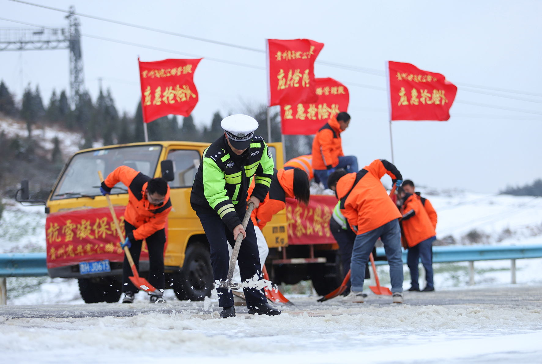 1月22 日,貴州省黔東南苗族侗族自治州丹寨縣交警部門會(huì)同相關(guān)部門對(duì)凝凍路段進(jìn)行融冰除雪作業(yè),及時(shí)恢復(fù)道路正常通行,確保群眾出行安全。