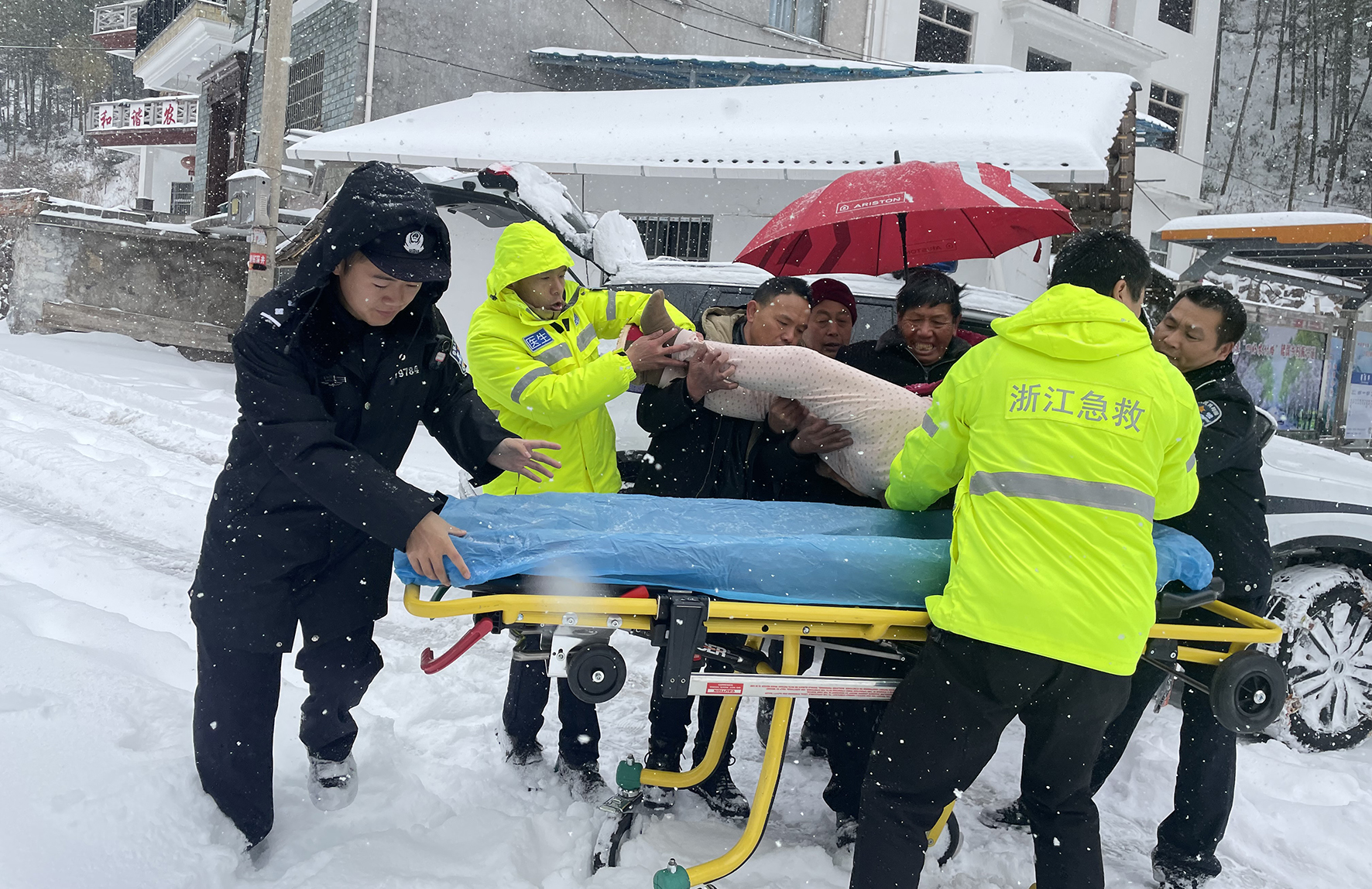 1月22日,浙江省遂昌縣高坪鄉(xiāng)茶樹坪村一村民因雪天路滑摔倒受傷嚴(yán)重,救護(hù)車因積雪嚴(yán)重停在半路無法到達(dá)。遂昌縣公安局北界新路灣派出所民警得知情況后,與救護(hù)人員、當(dāng)?shù)厝罕娨黄饘⑹軅迕癜踩o(hù)送到救護(hù)車上。