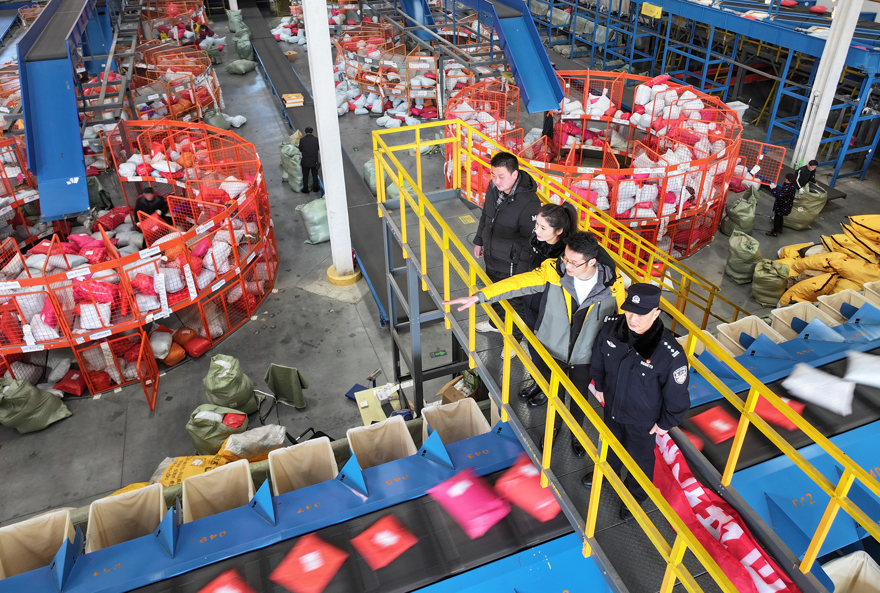 1月23日,在江蘇省南通市海門(mén)區(qū)三星鎮(zhèn)深國(guó)際·疊石橋現(xiàn)代國(guó)際物流園區(qū),海門(mén)區(qū)公安局“企無(wú)憂(yōu)”服務(wù)隊(duì)民警走進(jìn)分揀中心,了解安全生產(chǎn)情況,宣傳寄遞業(yè)相關(guān)法律。