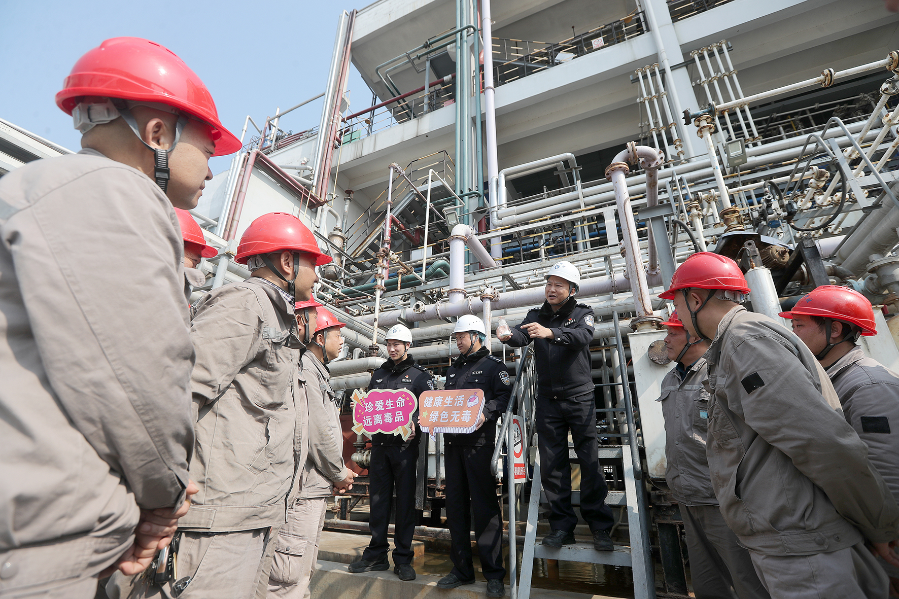 2月18日,湖北省荊門市公安局高新區(qū)·掇刀區(qū)分局民警在易制毒企業(yè),利用“班前會”向企業(yè)員工普及禁毒知識和相關(guān)法律法規(guī)。