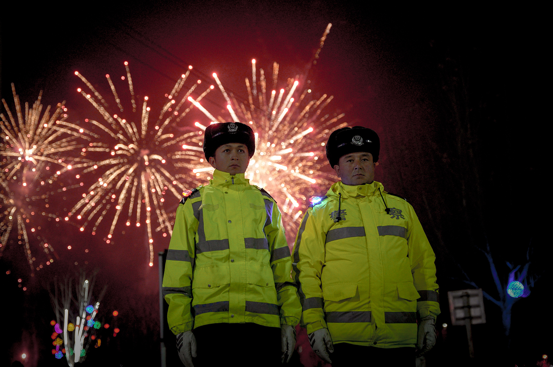 2月24日,新疆皮山縣石榴廣場舉行煙花表演。皮山交警堅(jiān)守崗位,確保群眾歡度元宵。