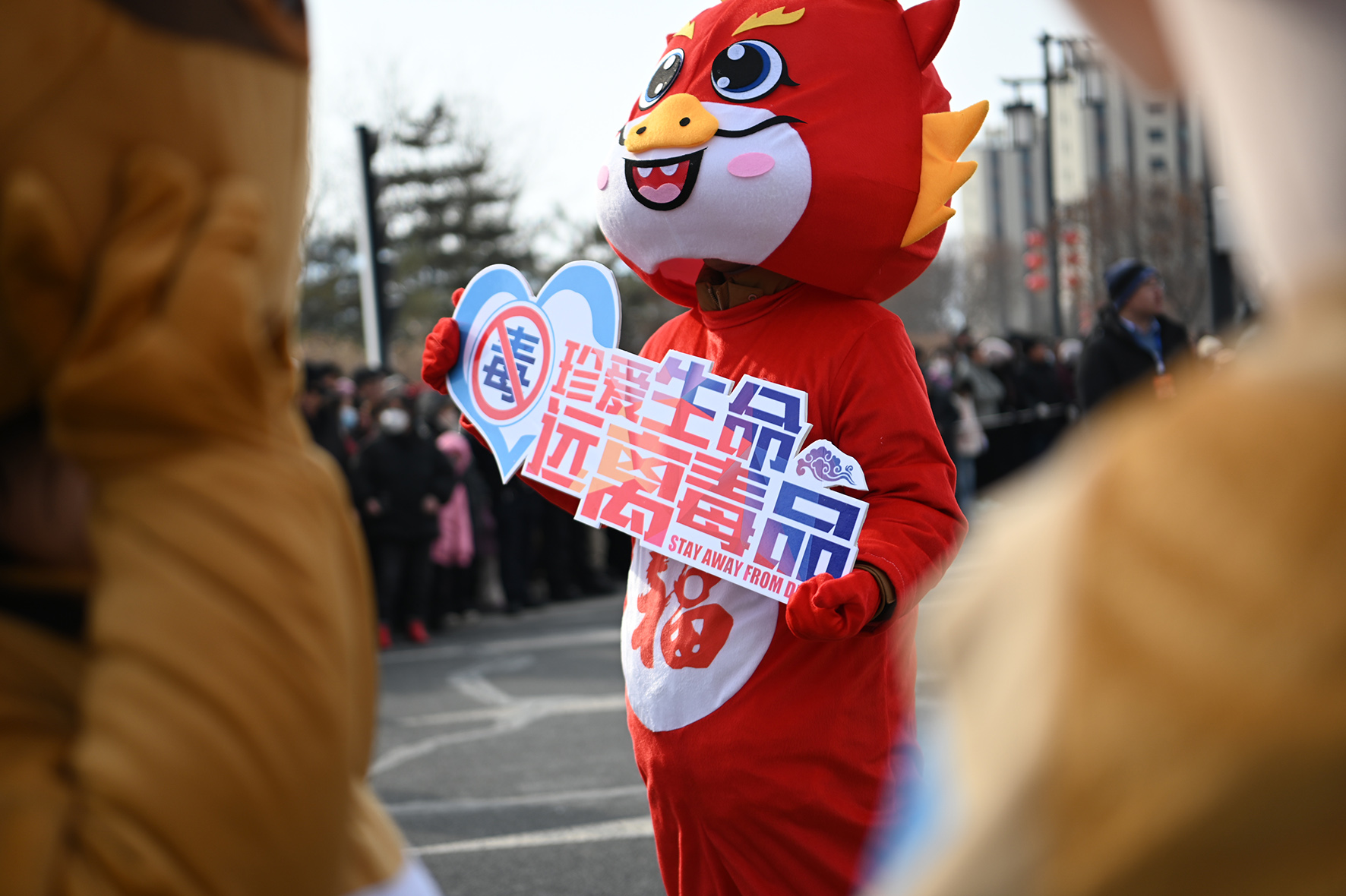 2月24日,山西省大同市廣靈縣元宵節(jié)文藝活動(dòng)表演現(xiàn)場,禁毒宣傳志愿者在開展禁毒知識(shí)宣傳。