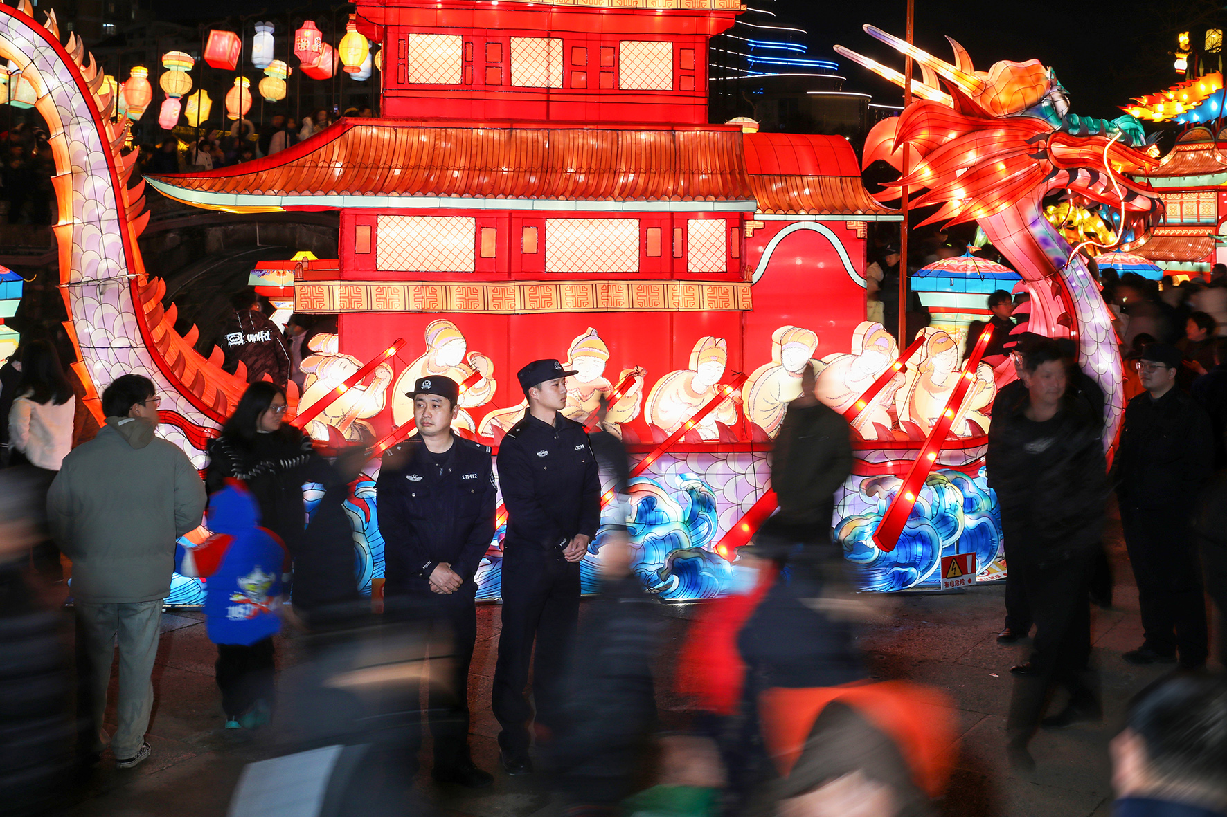 2月24日,江蘇泰州老街觀賞燈會(huì)的民眾絡(luò)繹不絕,泰州市公安局海陵分局精心組織好安保工作,守護(hù)平安。