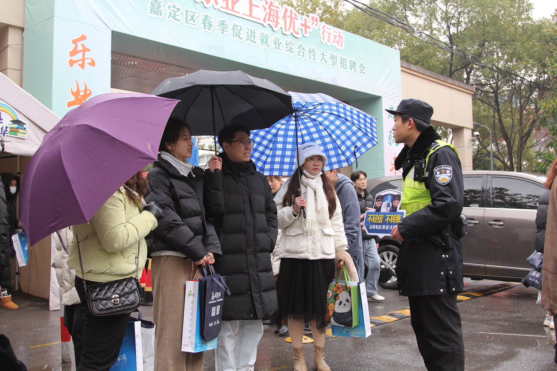 2月24日,上海市公安局嘉定分局民警冒雨在春季招聘會現(xiàn)場開展反電信網(wǎng)絡詐騙、交通安全等知識宣傳。