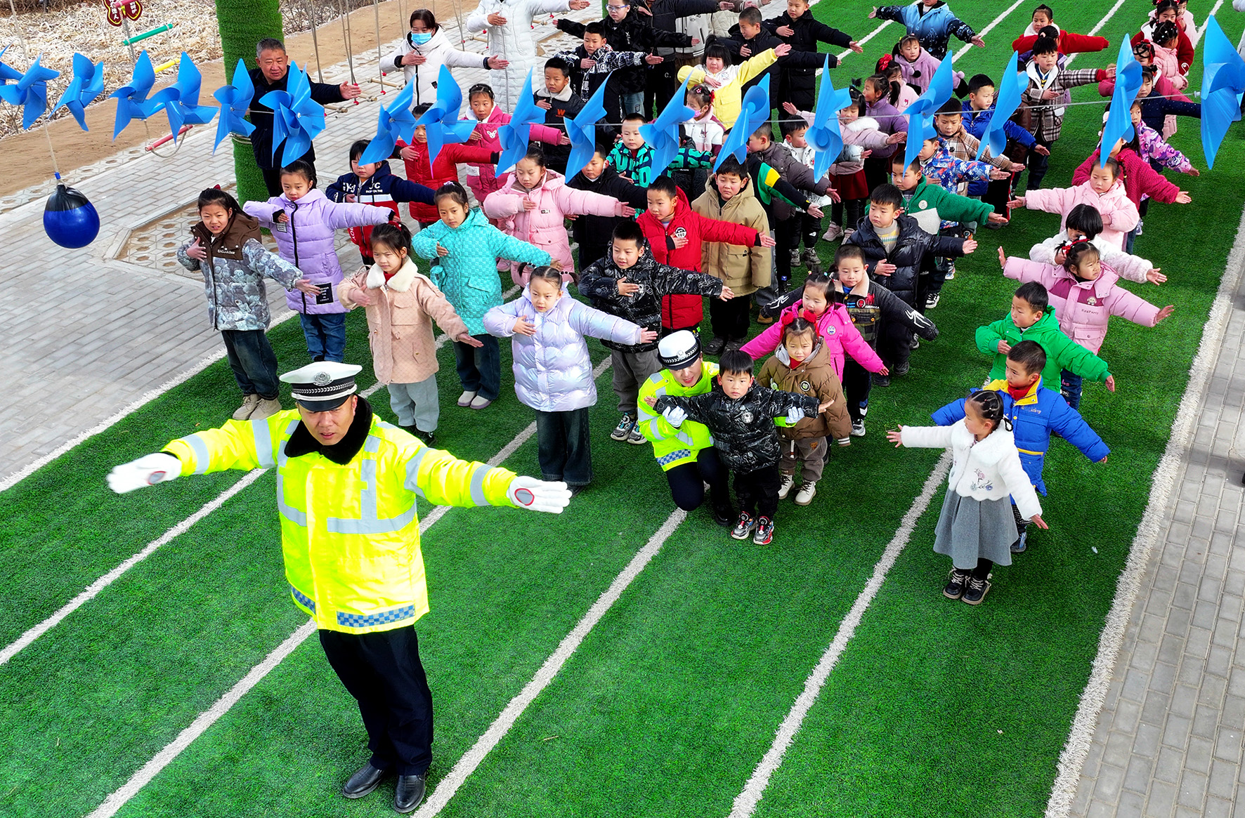 2月26日,山東省煙臺市公安局交警支隊第五大隊民警在為高新區(qū)益文小學(xué)的同學(xué)們上“開學(xué)第一課”,普及交通安全知識。