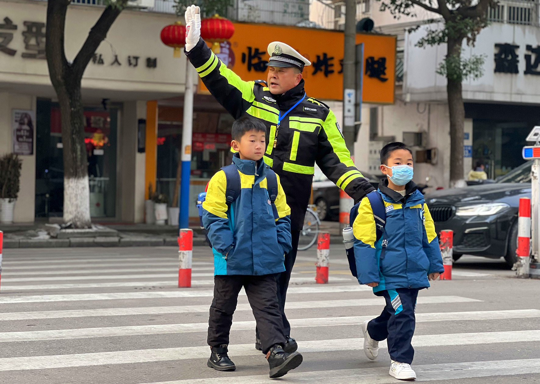 2月26日,安徽省亳州市公安局交警支隊五大隊鐵騎中隊民警輔警在護(hù)學(xué)崗守護(hù)學(xué)生上學(xué)路。