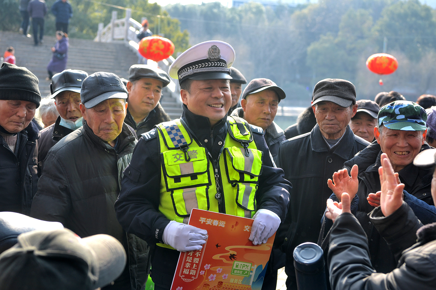 2月25日,在安徽省巢湖市洗耳池公園,巢湖市公安局交警大隊民警為市民講解道路交通安全常識。