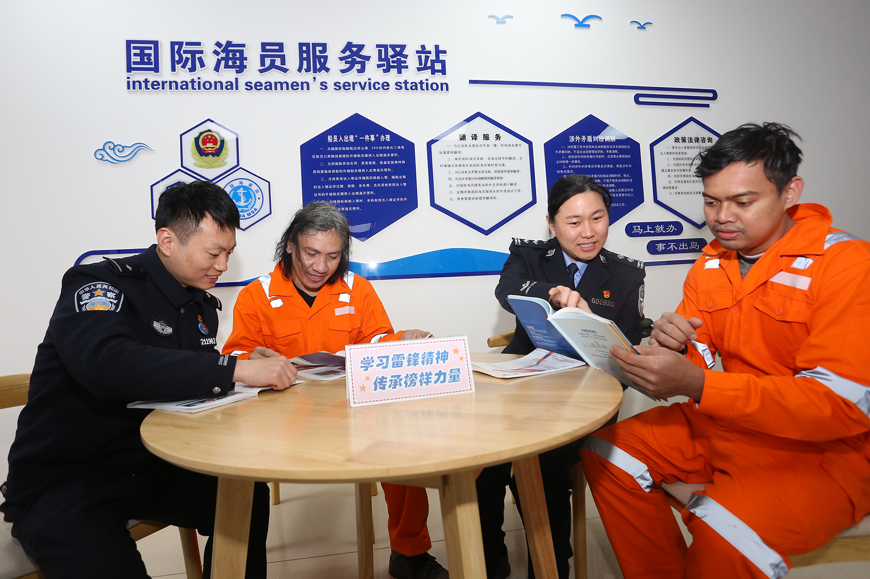 圖為民警正在為國際海員進(jìn)行政策宣講、解答。