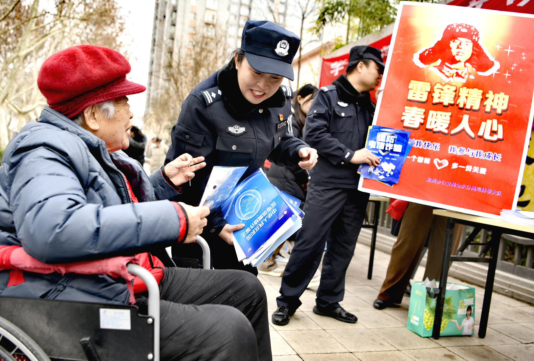 3月5日,河南省鄭州市公安局金水分局巡特警隊(duì)員來到轄區(qū)開展“學(xué)雷鋒春暖人心”服務(wù)活動。