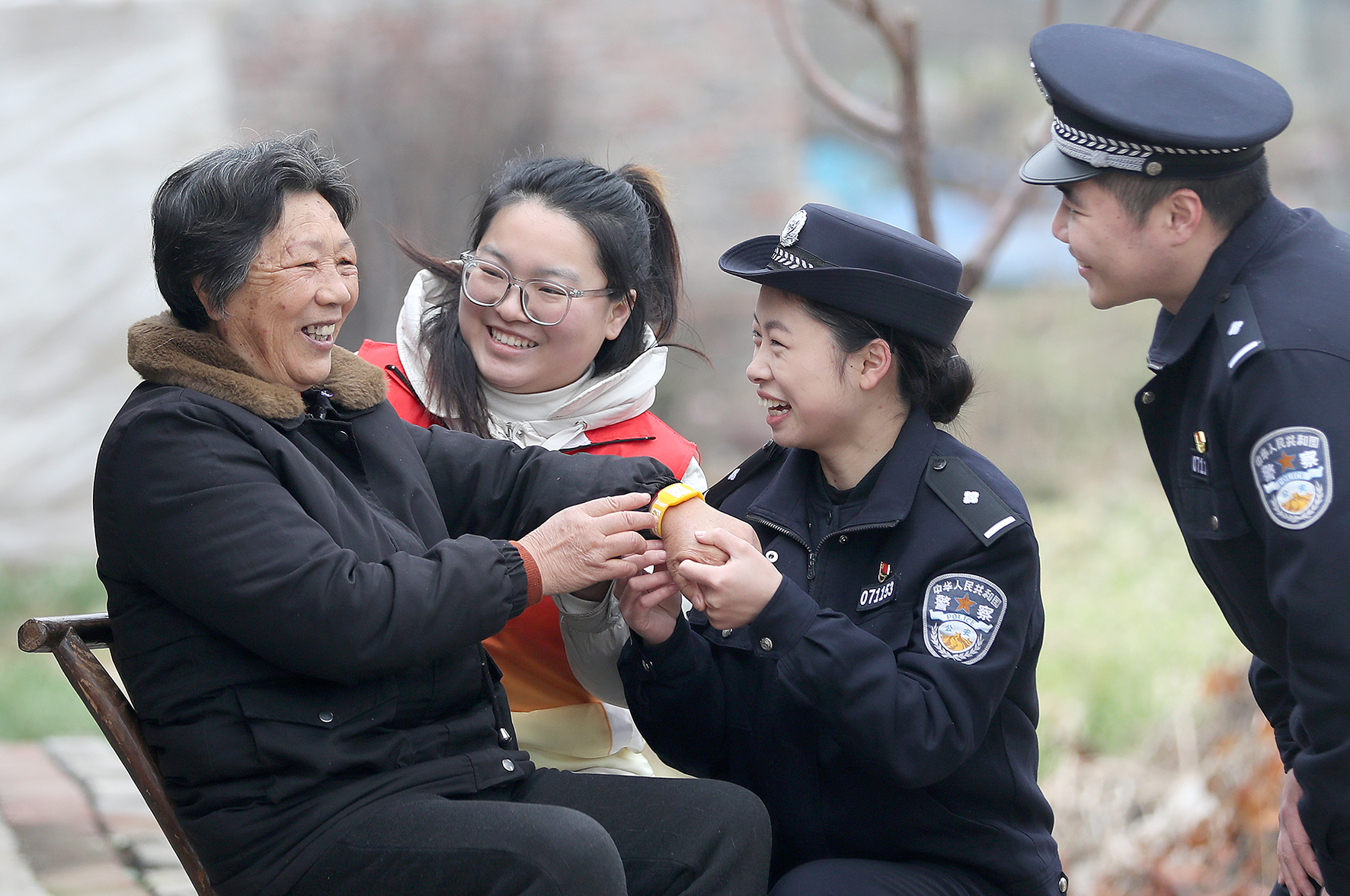 3月5日是第61個(gè)全國學(xué)雷鋒紀(jì)念日,湖北省荊門市公安局漳河新區(qū)分局雙喜派出所民警聯(lián)合義工,在楊店村為老人免費(fèi)發(fā)放預(yù)防走失的“黃手環(huán)”。