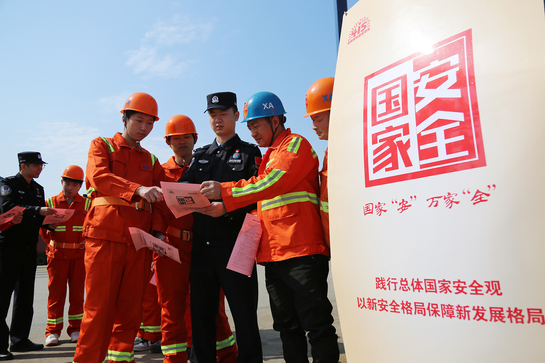 圖為4月10日,民警在大榭港區(qū)集裝箱碼頭開(kāi)展國(guó)家安全教育。