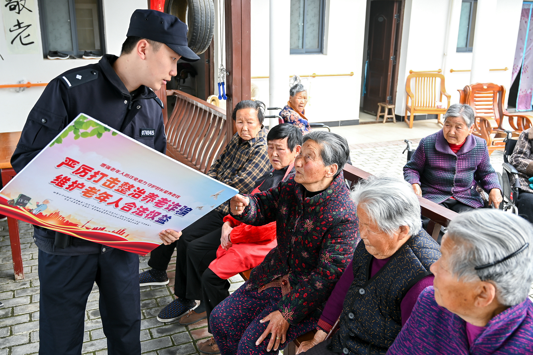 4月23日,安徽省馬鞍山市和縣公安局經(jīng)偵大隊民警在向老人開展預(yù)防養(yǎng)老詐騙法治宣傳。民警通過具體案例,揭露以房養(yǎng)老、低價旅游、投資理財?shù)雀鞣N形式的詐騙套路,幫助老年人提高識騙和防騙能力。