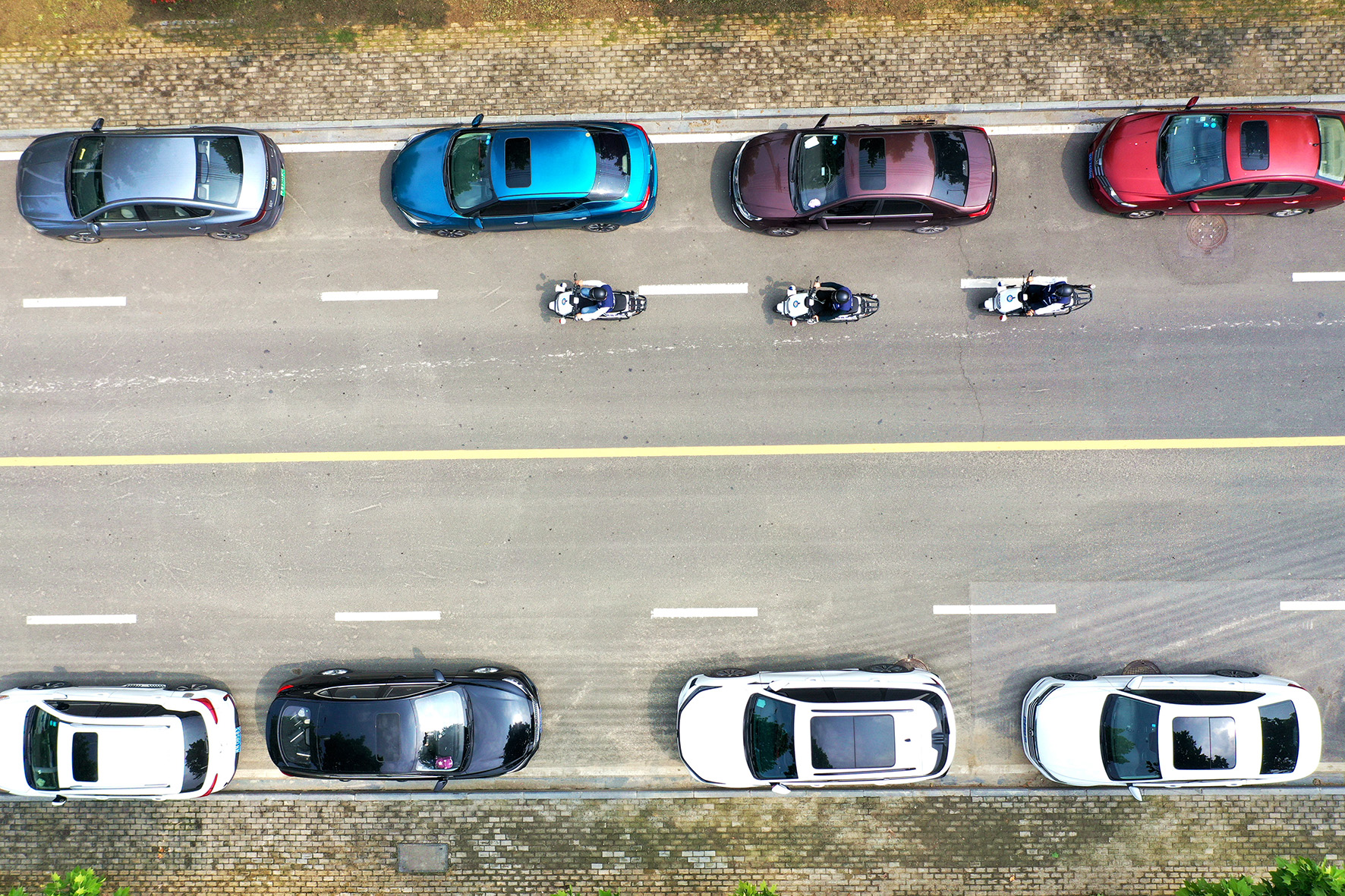 圖一:網(wǎng)格員騎著由派出所配備的電動(dòng)車在工業(yè)園區(qū)道路上巡邏。