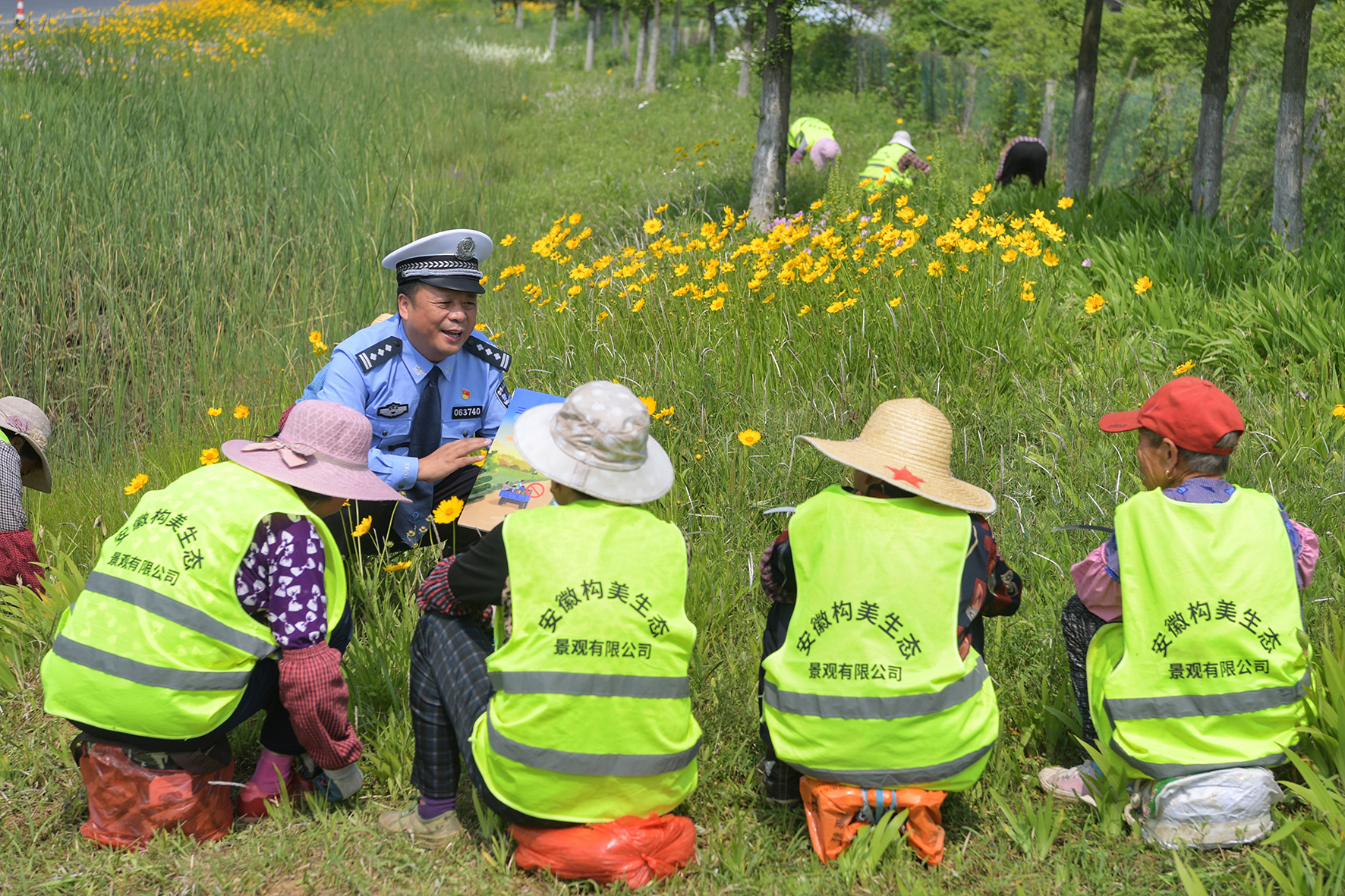 5月8日,安徽省巢湖市公安局交警大隊民警對路邊作業(yè)的綠化工人進行交通安全宣傳。