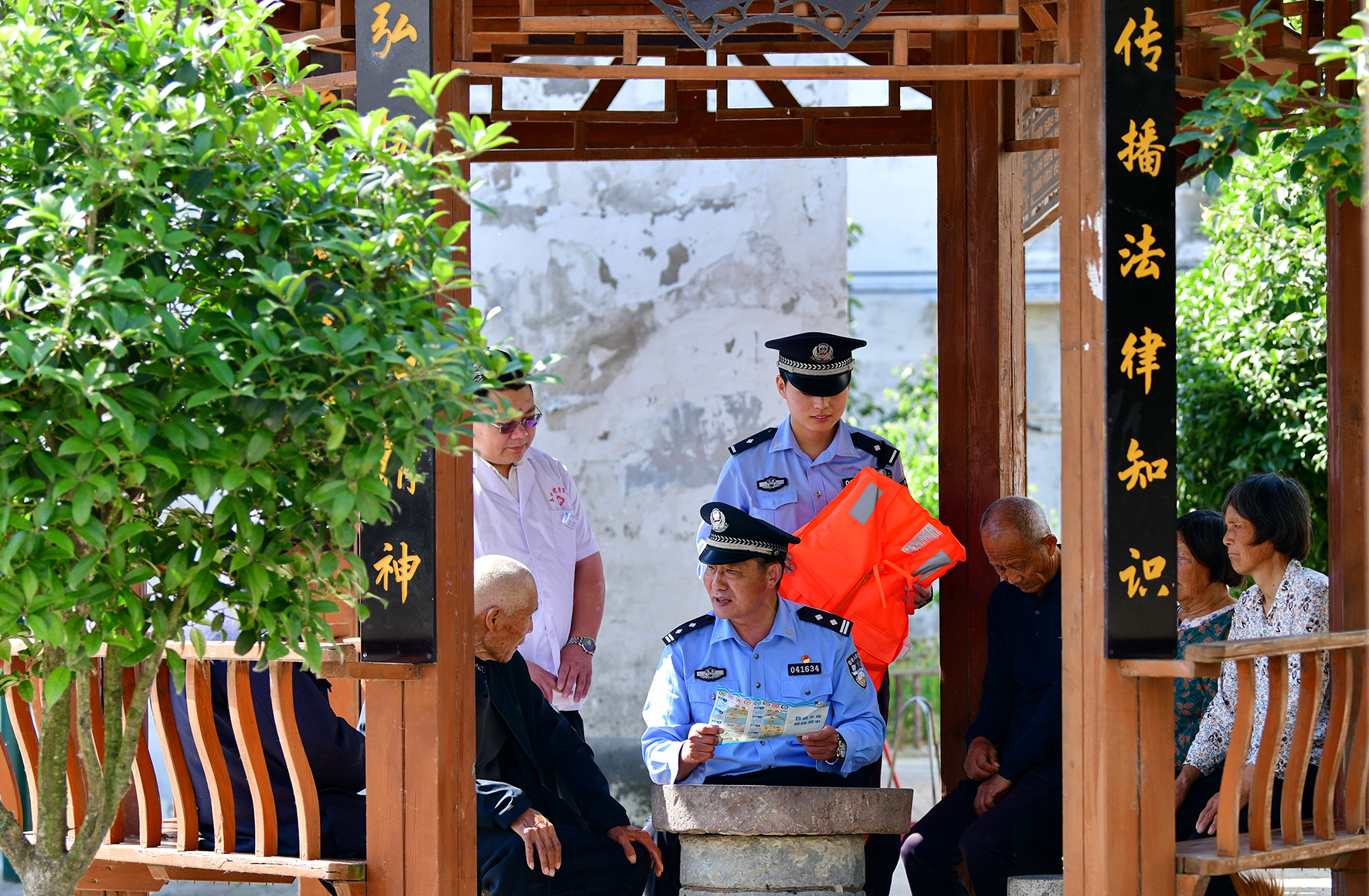 5月10日,安徽省阜南縣公安局安崗派出所民警在曹集鎮(zhèn)西田陂莊臺的普法宣講亭里向村民們宣講防范養(yǎng)老詐騙、防溺水等知識。