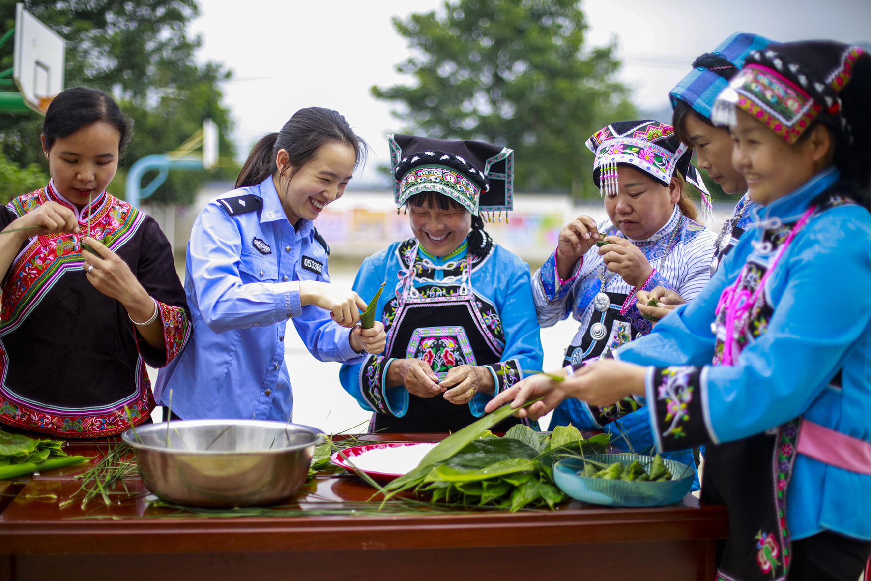 6月6日,貴州省黔西市公安局五里布依族苗鄉(xiāng)派出所民警到轄區(qū)內(nèi)的中心村和布依群眾一起包粽子,并向布依群眾講解普及禁毒、預(yù)防電信網(wǎng)絡(luò)詐騙、養(yǎng)老詐騙等知識(shí)。