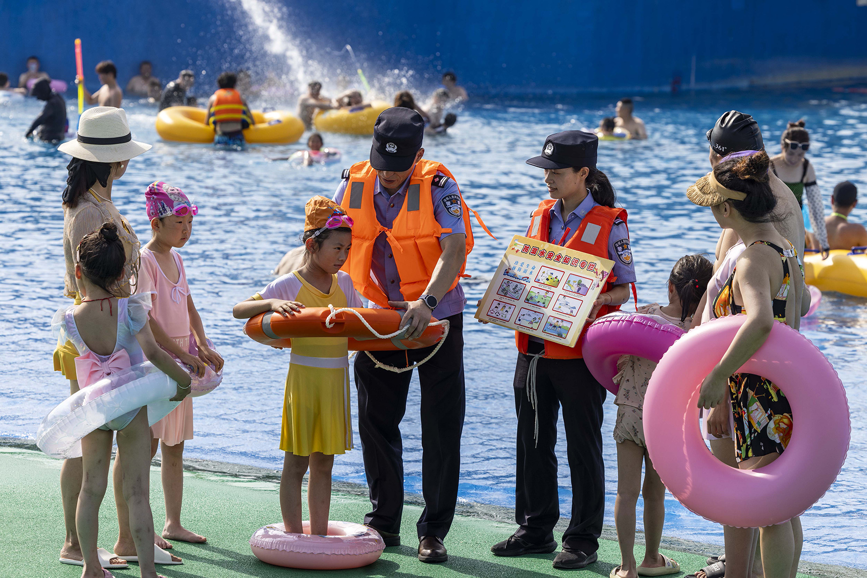 7月7日,江蘇省泰州市公安局海陵分局聯(lián)合泰州市紅十字應(yīng)急救援隊把防溺水自救培訓(xùn)的安全課堂搬到水上樂園,通過現(xiàn)場講解、模擬急救等形式,為家長和兒童詳細(xì)講解防溺水及自救知識。