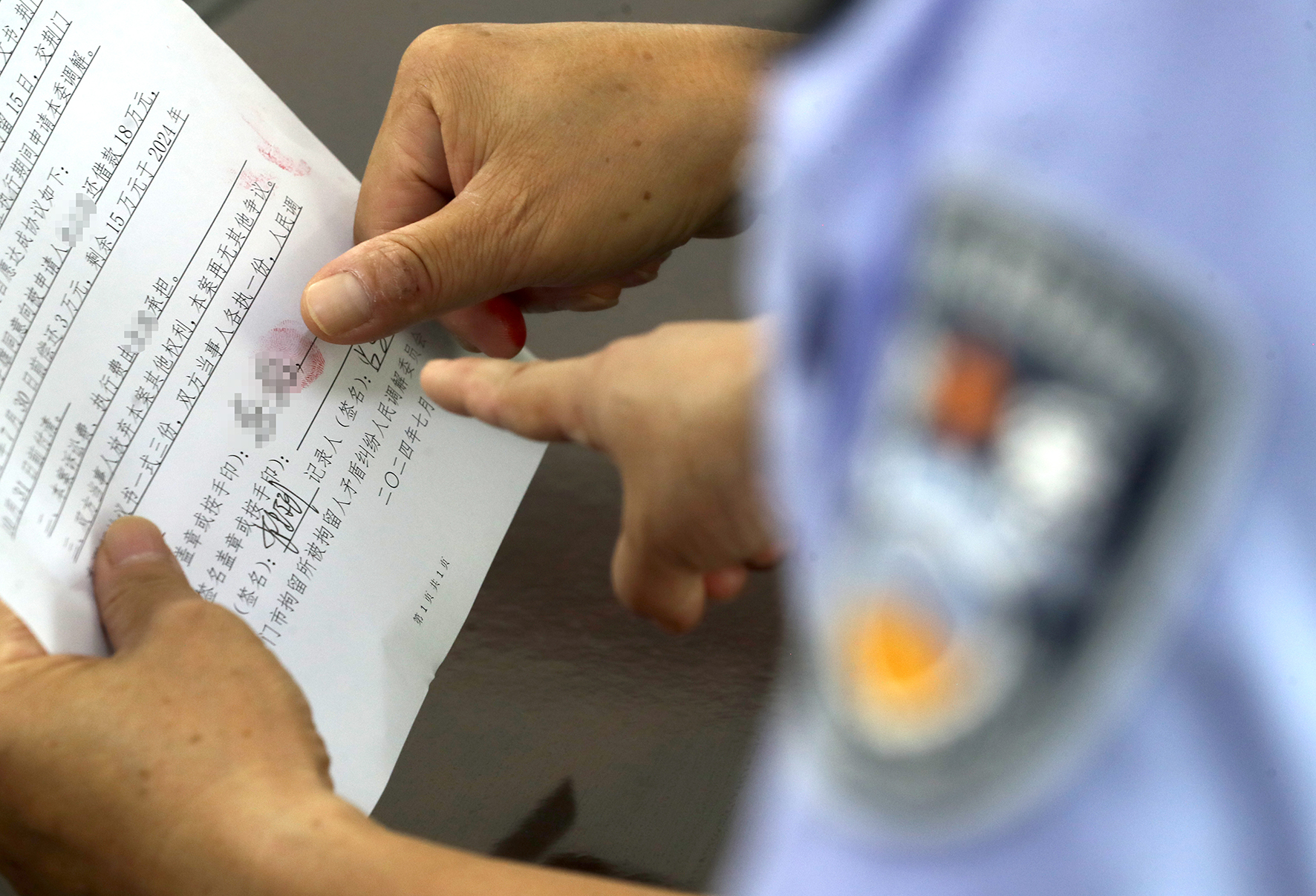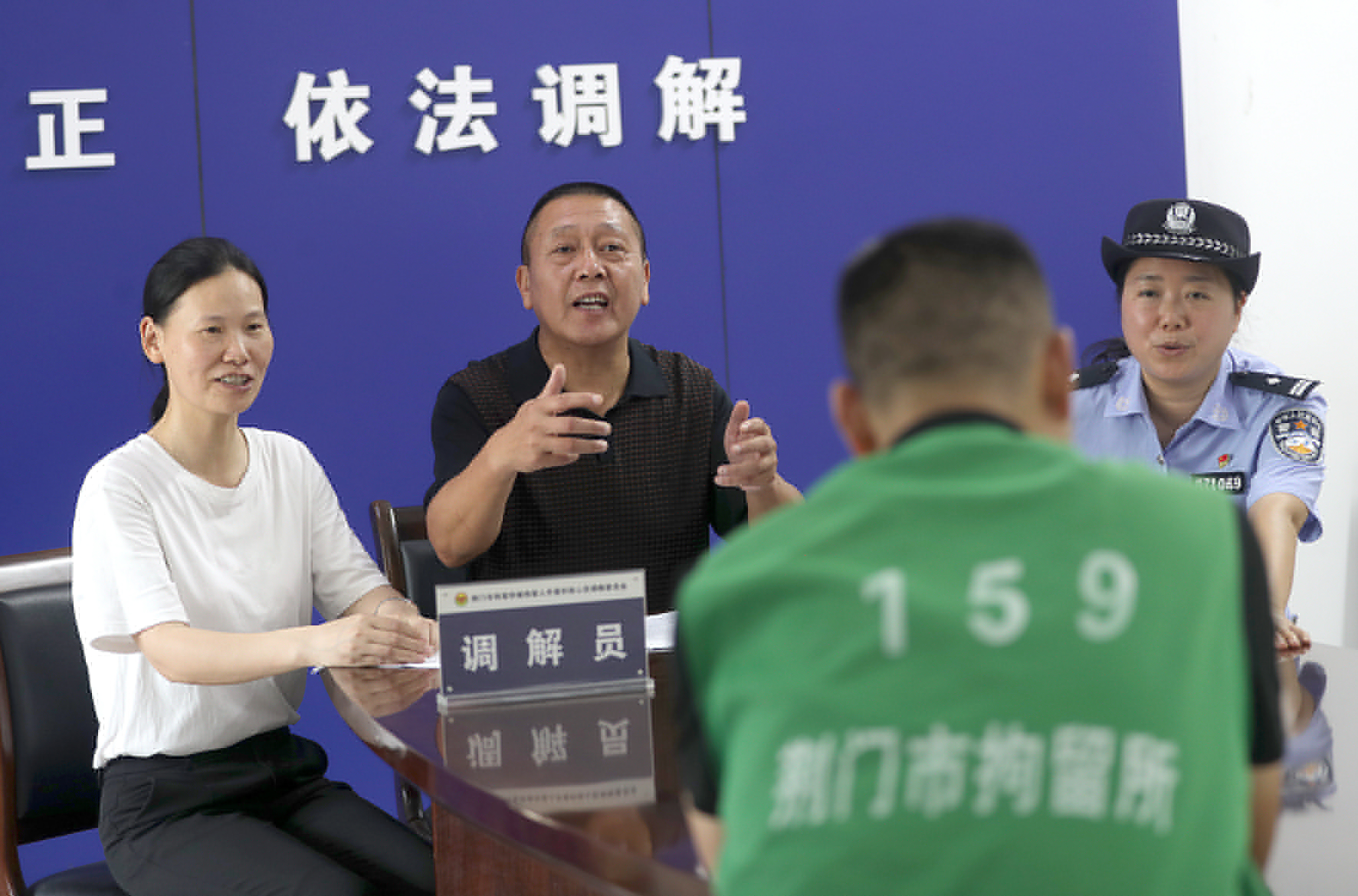 圖二:7月8日,在荊門(mén)市拘留所,人民調(diào)解員、執(zhí)行法官和律師通過(guò)“聯(lián)動(dòng)調(diào)解”,督促“老賴”履行相關(guān)義務(wù)。