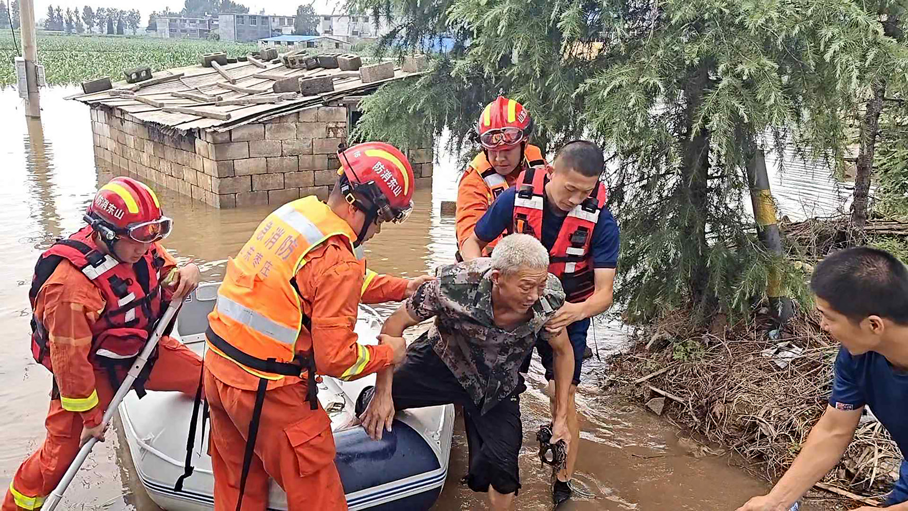 7月9日,受持續(xù)強(qiáng)降雨影響,山東省棗莊市山亭區(qū)桑村鎮(zhèn)西大河村被淹,山亭區(qū)翼云消防救援站救援人員利用橡皮舟轉(zhuǎn)移被困群眾。
