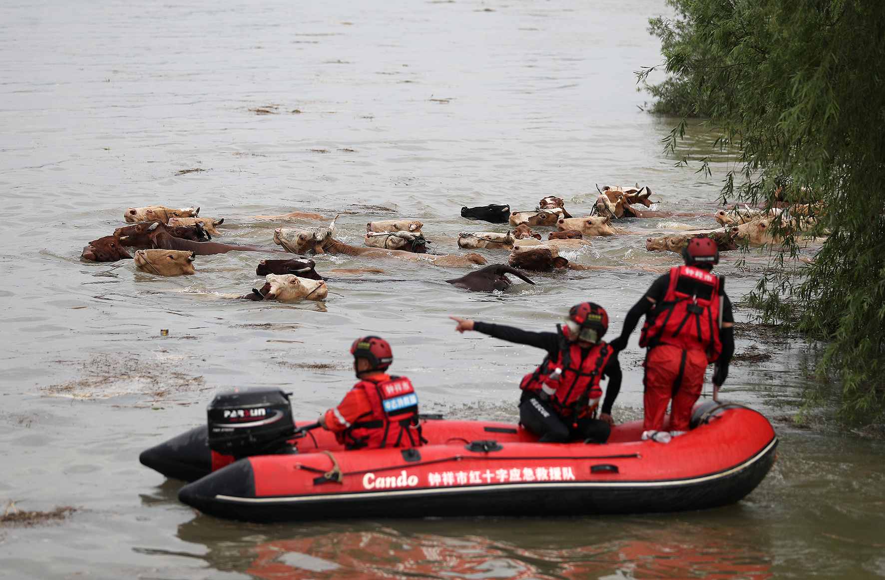 7月15日,受降雨及上游泄洪影響,漢江湖北省鐘祥柴湖段水位持續(xù)上漲,鐘祥市柴湖鎮(zhèn)中心集村村民肖春華散養(yǎng)在漢江江灘的42頭黃牛被江水圍困,隨時(shí)有被大水沖走的危險(xiǎn)。危急時(shí)刻,鐘祥市公安局迅速組織柴湖派出所、中志協(xié)應(yīng)急救援隊(duì)、莫愁義警趕往現(xiàn)場實(shí)施救援。救援人員通過皮劃艇后方驅(qū)趕、前方涉水引導(dǎo)等方式將被圍困的牛群全部成功營救上岸。