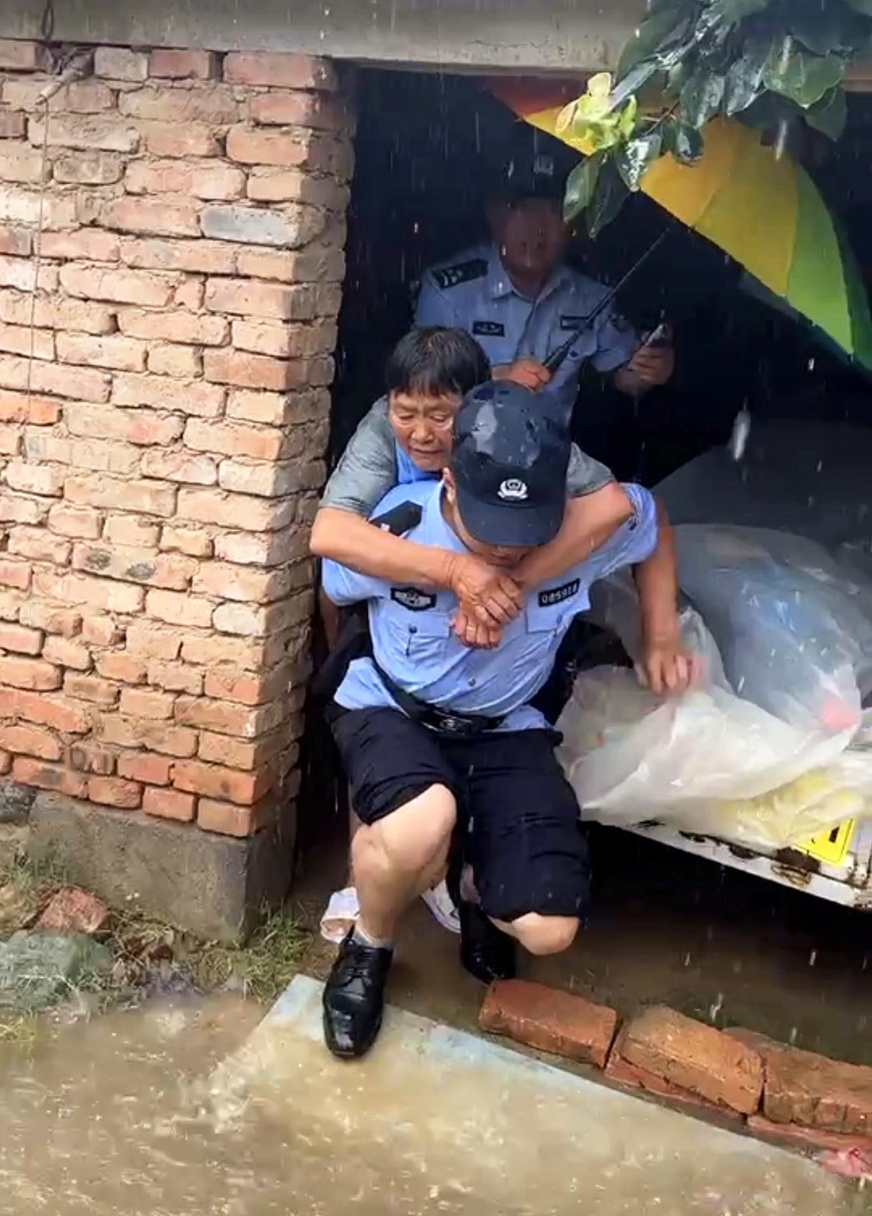 7月17日,安徽省亳州市公安局譙城分局顏集派出所民警迎著暴雨,將被困在家中的老人營救到安全區(qū)域,并妥善安置。