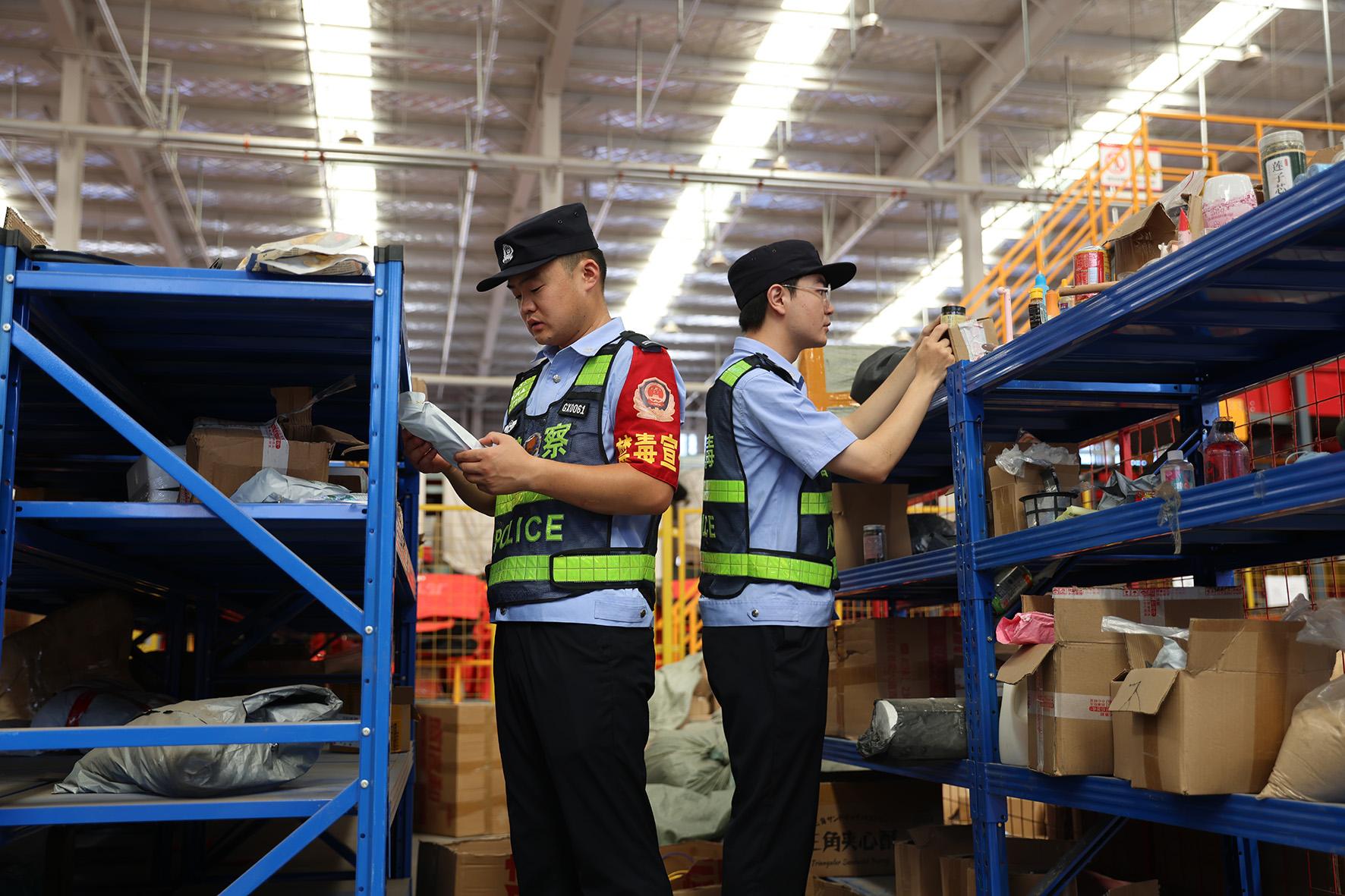 圖為民警對物流寄遞物品進(jìn)行嚴(yán)檢細(xì)查。