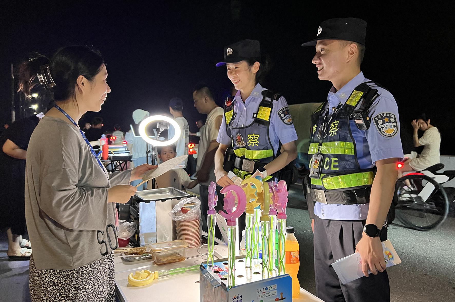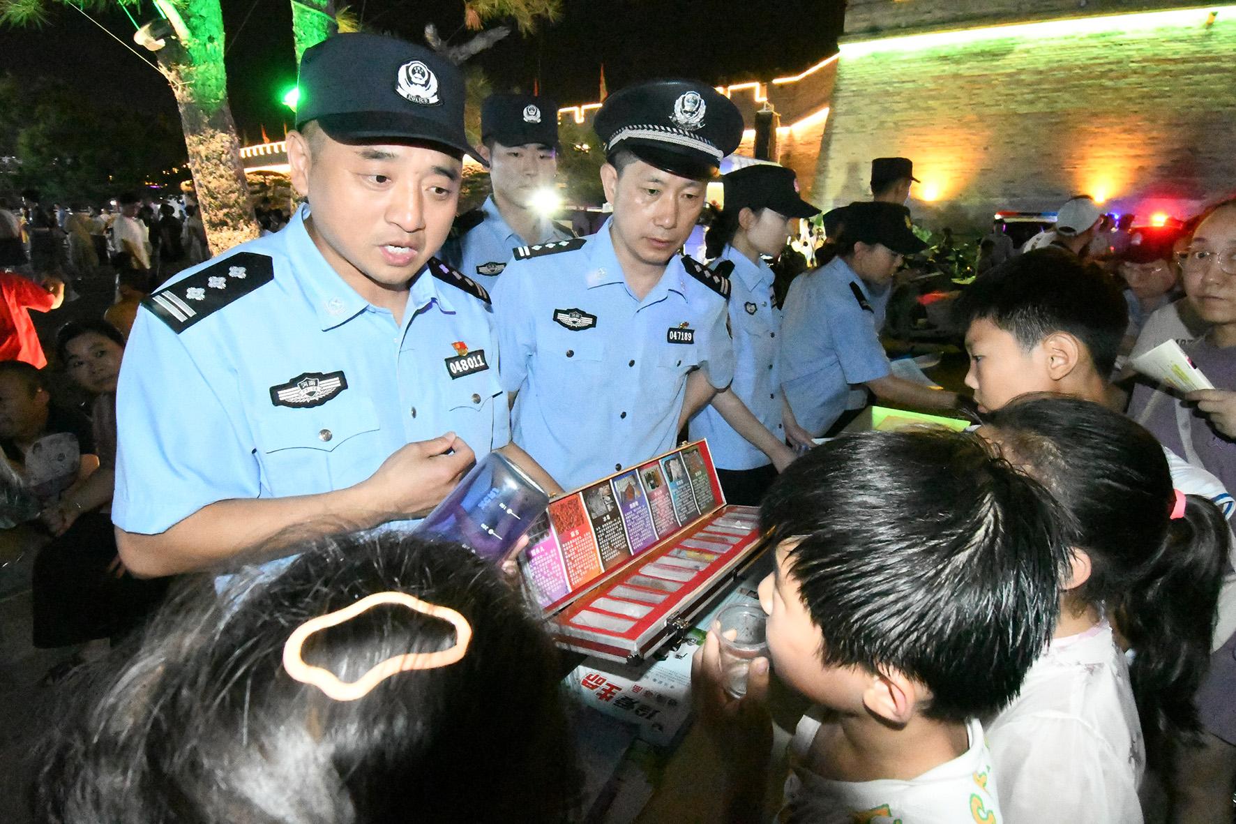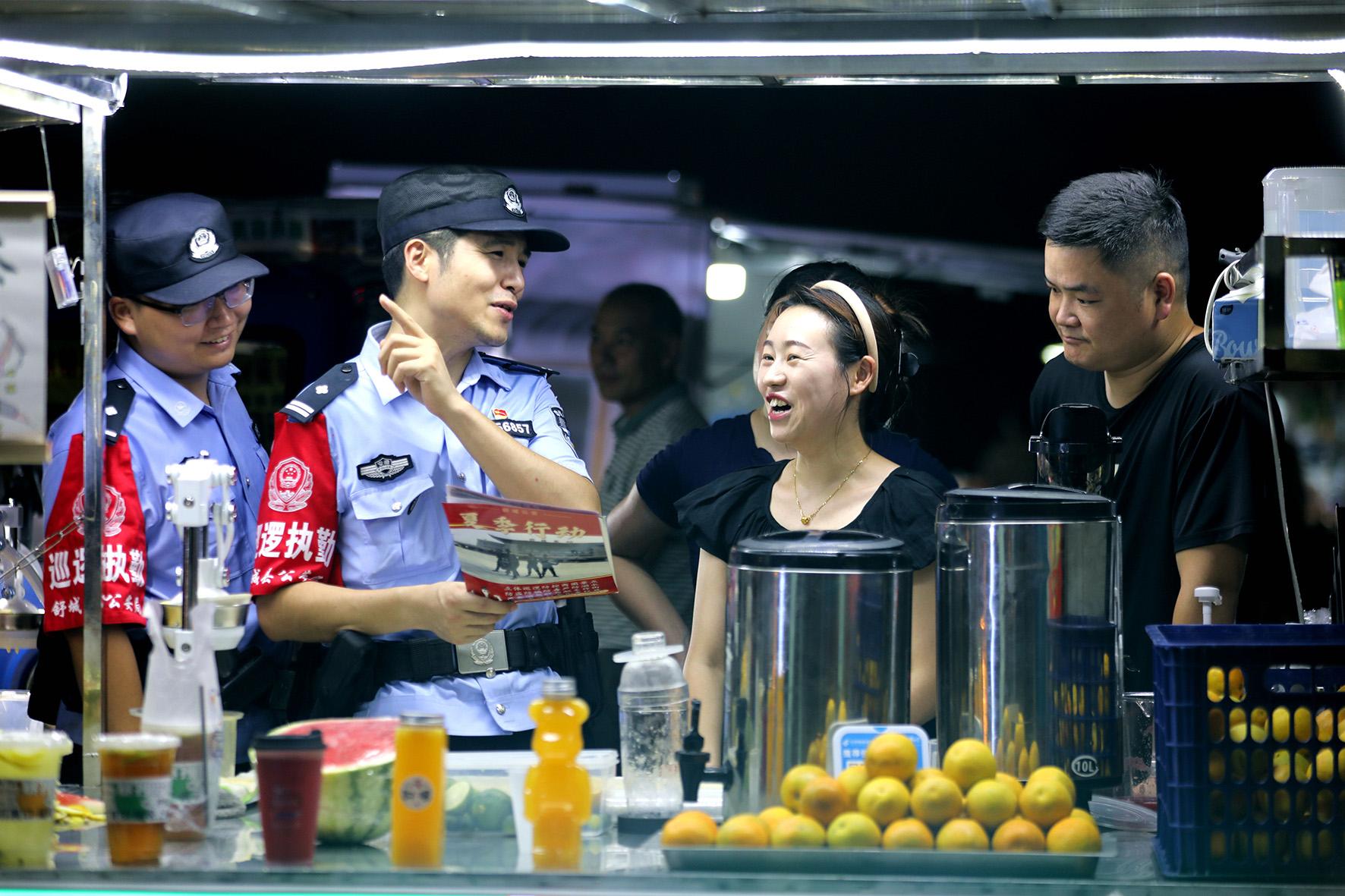 8月10日晚,河南省??h公安局結(jié)合夏夜治安巡查宣防集中統(tǒng)一行動(dòng),加大對(duì)轄區(qū)商圈、夜市、廣場(chǎng)等人員密集場(chǎng)所的檢查巡邏守護(hù)力度,向群眾宣傳反詐、禁毒、拒賭、防火防盜等安全防范知識(shí)。