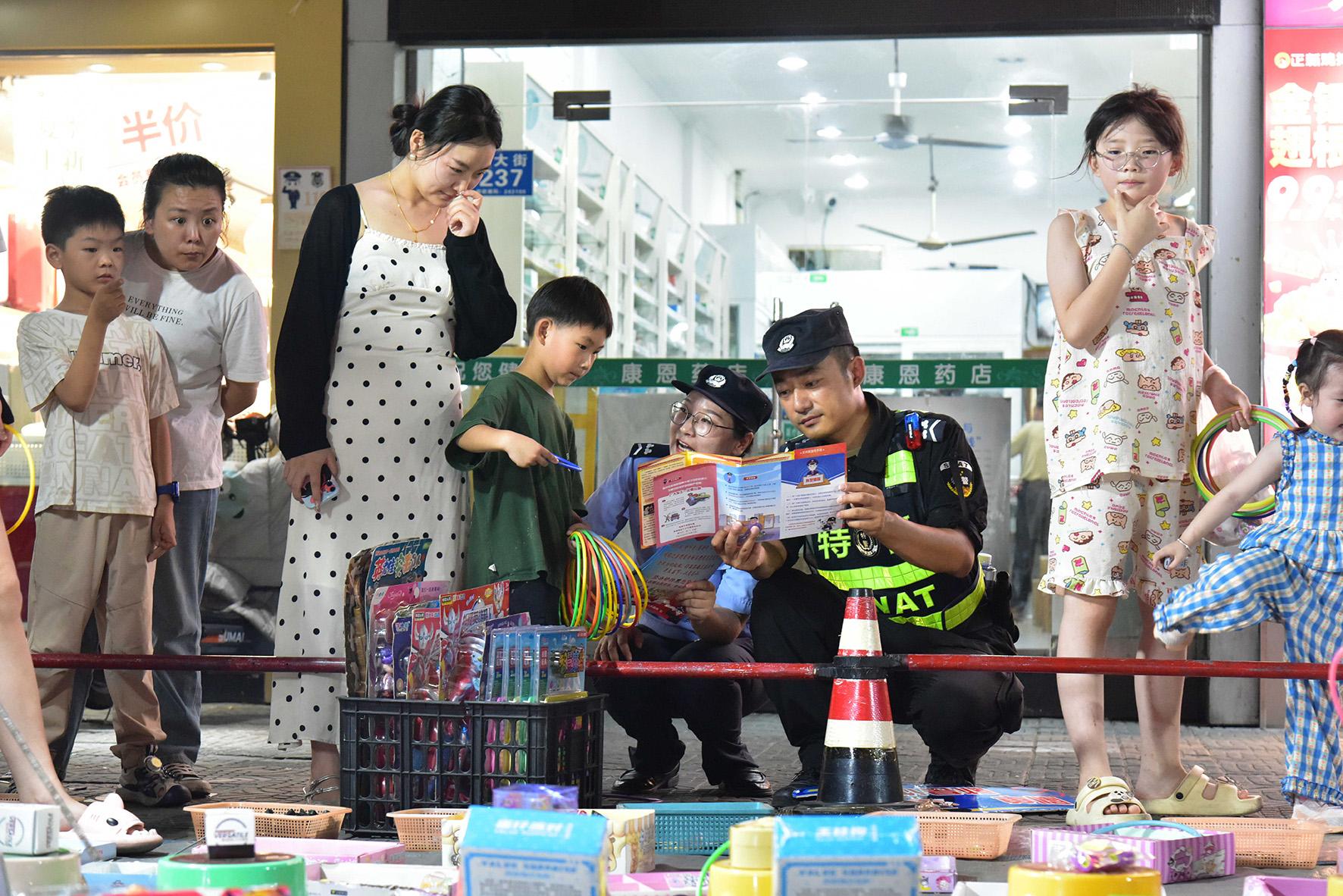 8月11日晚,安徽省和縣公安局經(jīng)偵、禁毒、刑偵等警種聯(lián)合在商業(yè)集中區(qū)域“擺夜攤”,與市民“零”距離互動(dòng),通過有獎(jiǎng)競(jìng)答,贈(zèng)送法治用品等形式,提升群眾自我保護(hù)意識(shí)和法治意識(shí)。