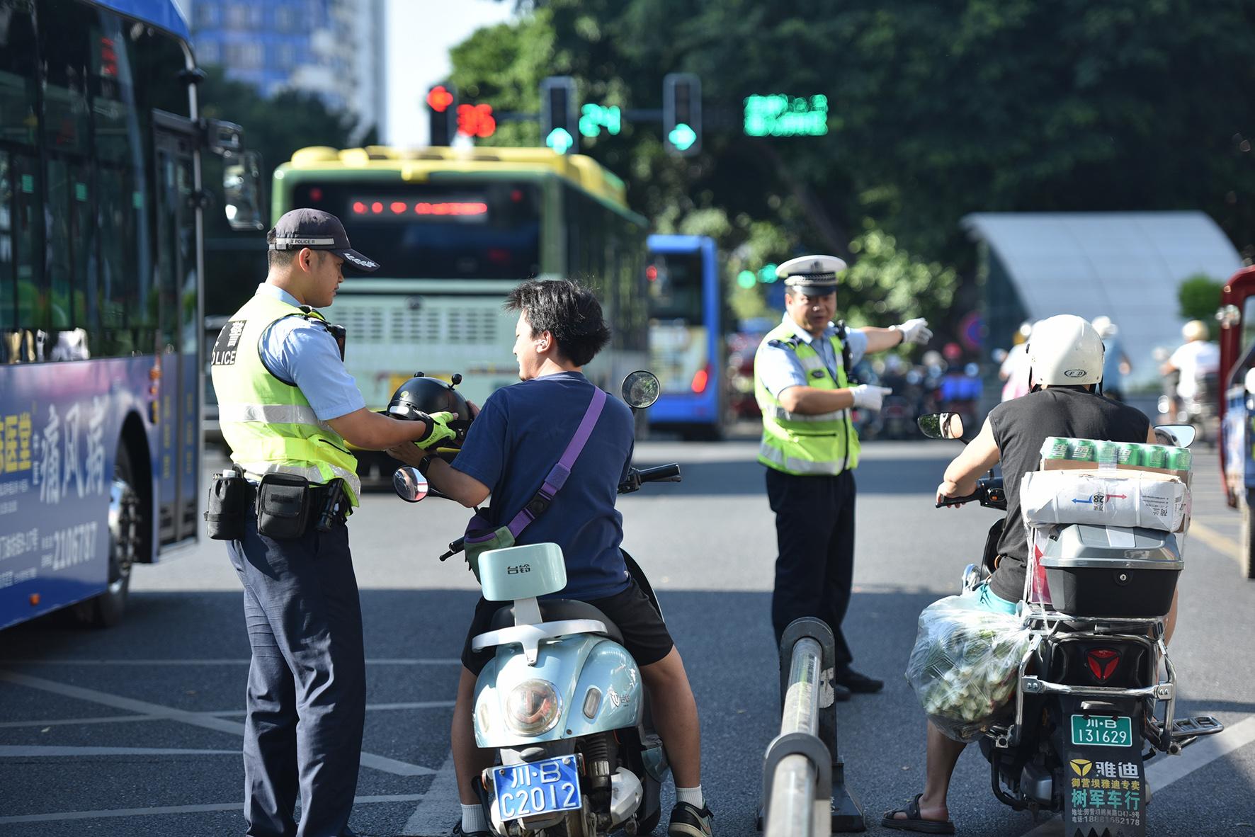 圖為8月13日,民輔警在路口糾正勸導(dǎo)騎乘人員要規(guī)范佩戴安全頭盔。