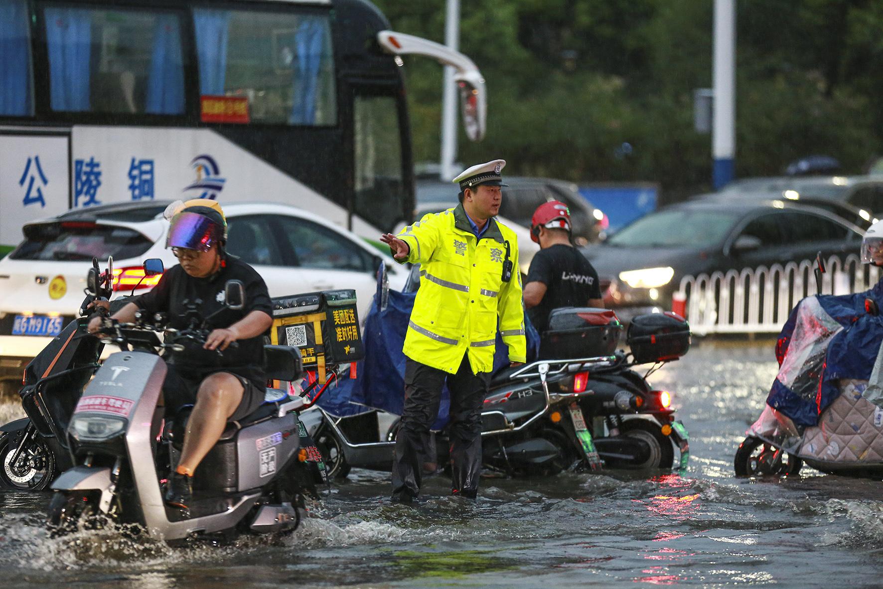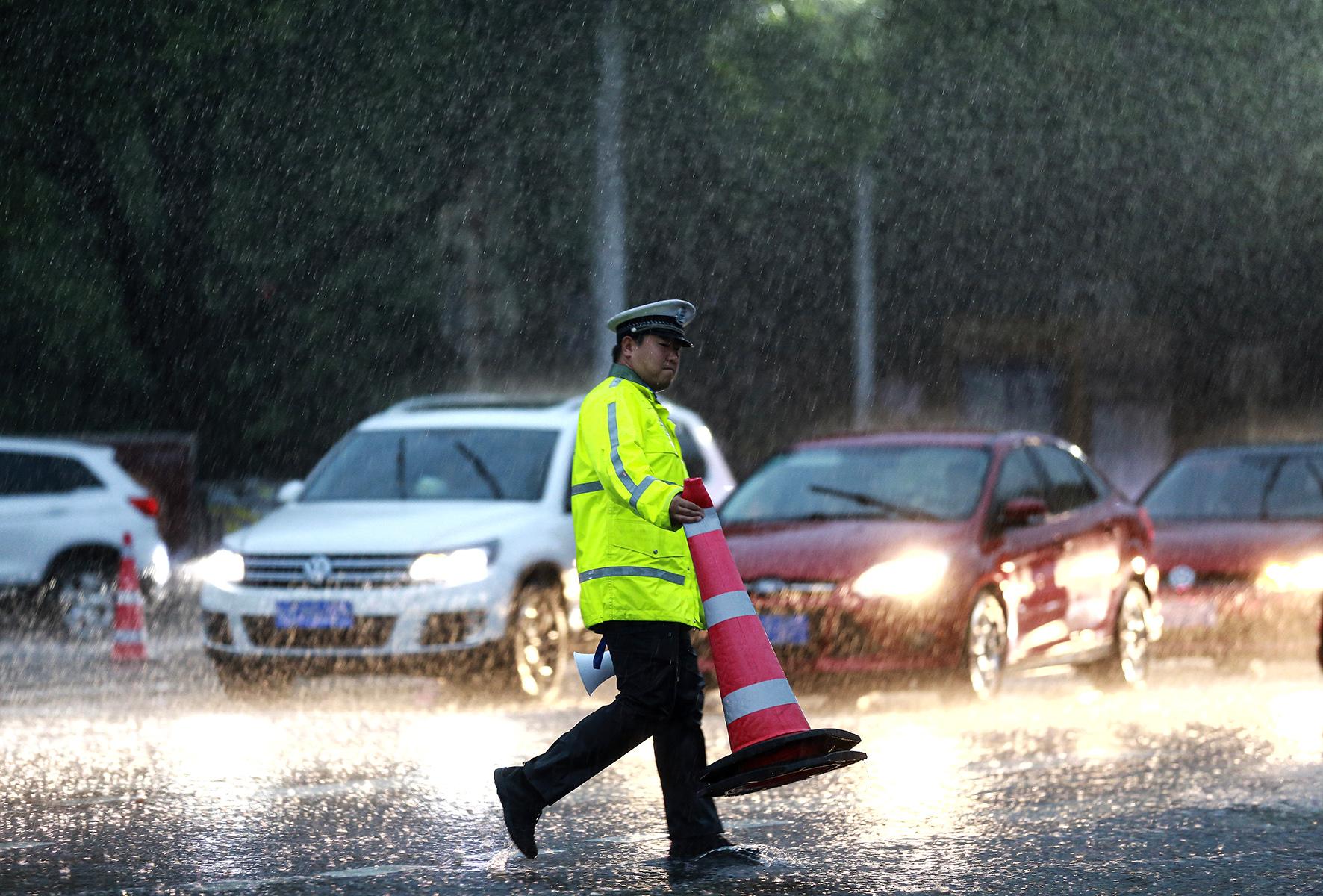 圖為民警在長(zhǎng)江路積水路段指揮疏導(dǎo)交通。