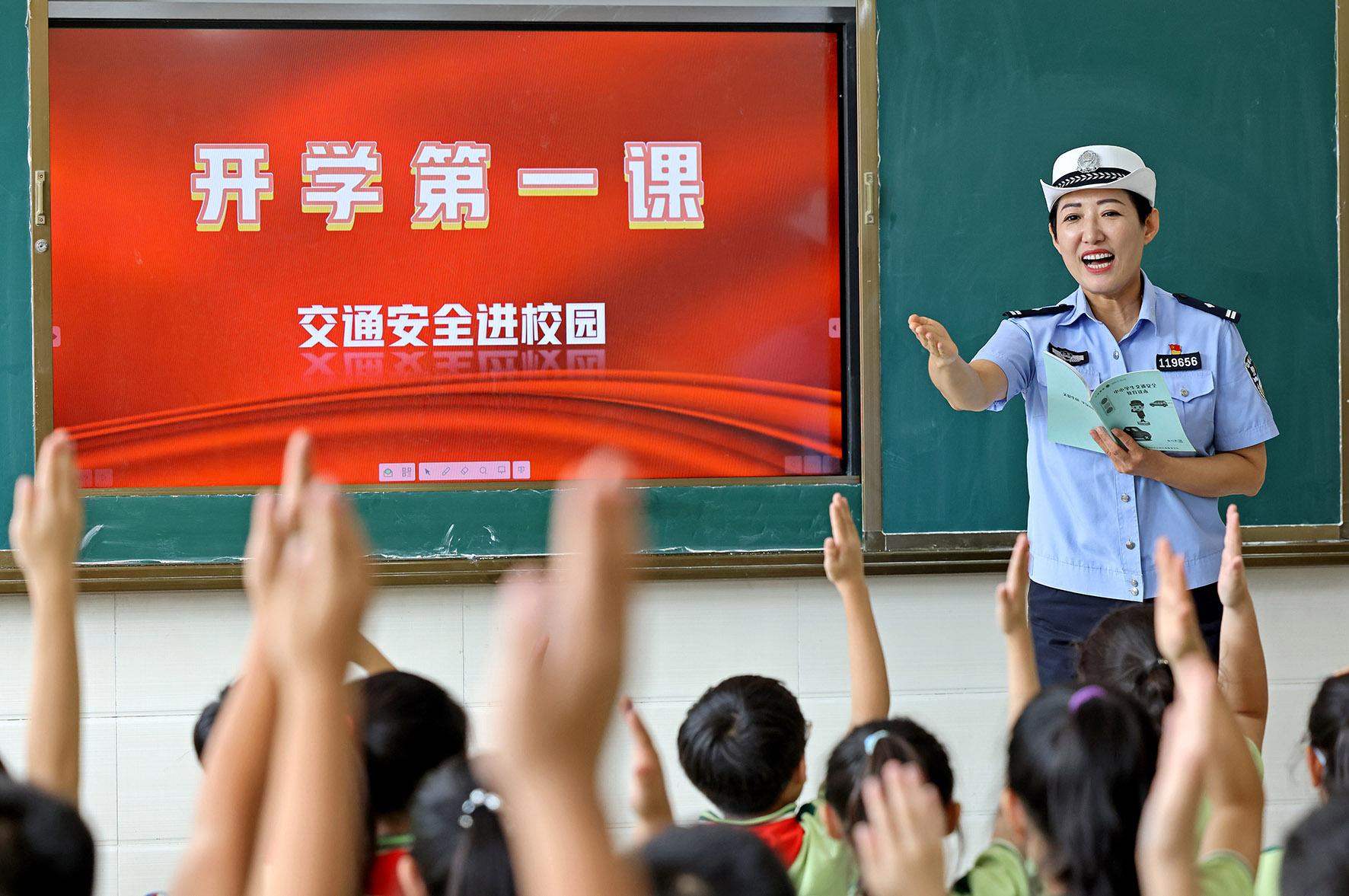9月2日,浙江省臺(tái)州市公安局黃巖分局新前派出所民警來(lái)到新前小學(xué),給學(xué)生們上“開(kāi)學(xué)安全課”。