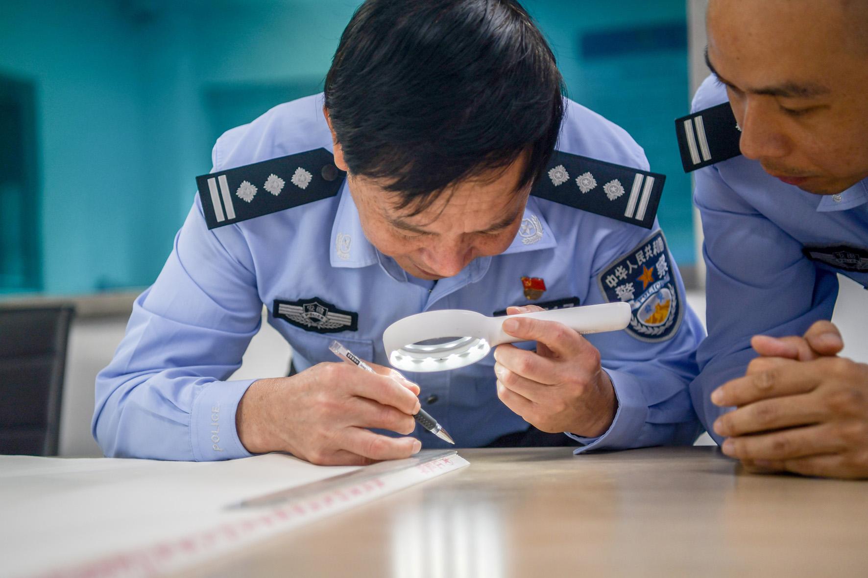 圖為10月11日,民警對(duì)假冒本土著名品牌宣紙的紋理、印刷、包裝工藝進(jìn)行勘驗(yàn)。