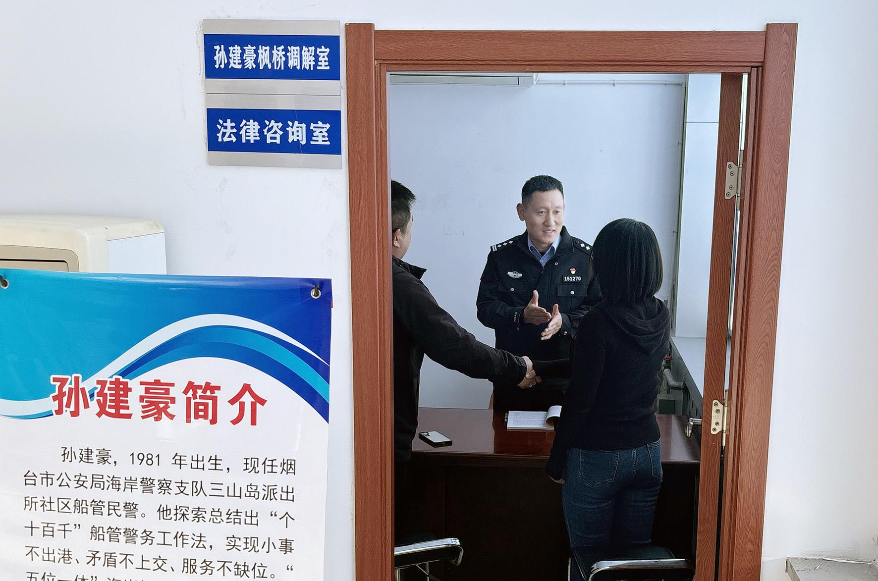 11月5日,山東省煙臺市海岸警察支隊三山島派出所民警孫建豪正在調(diào)解室內(nèi)調(diào)解一起糾紛。為推動矛盾糾紛排查化解工作,萊州市三山島街道辦事處成立以海岸民警孫建豪命名的楓橋調(diào)解室。