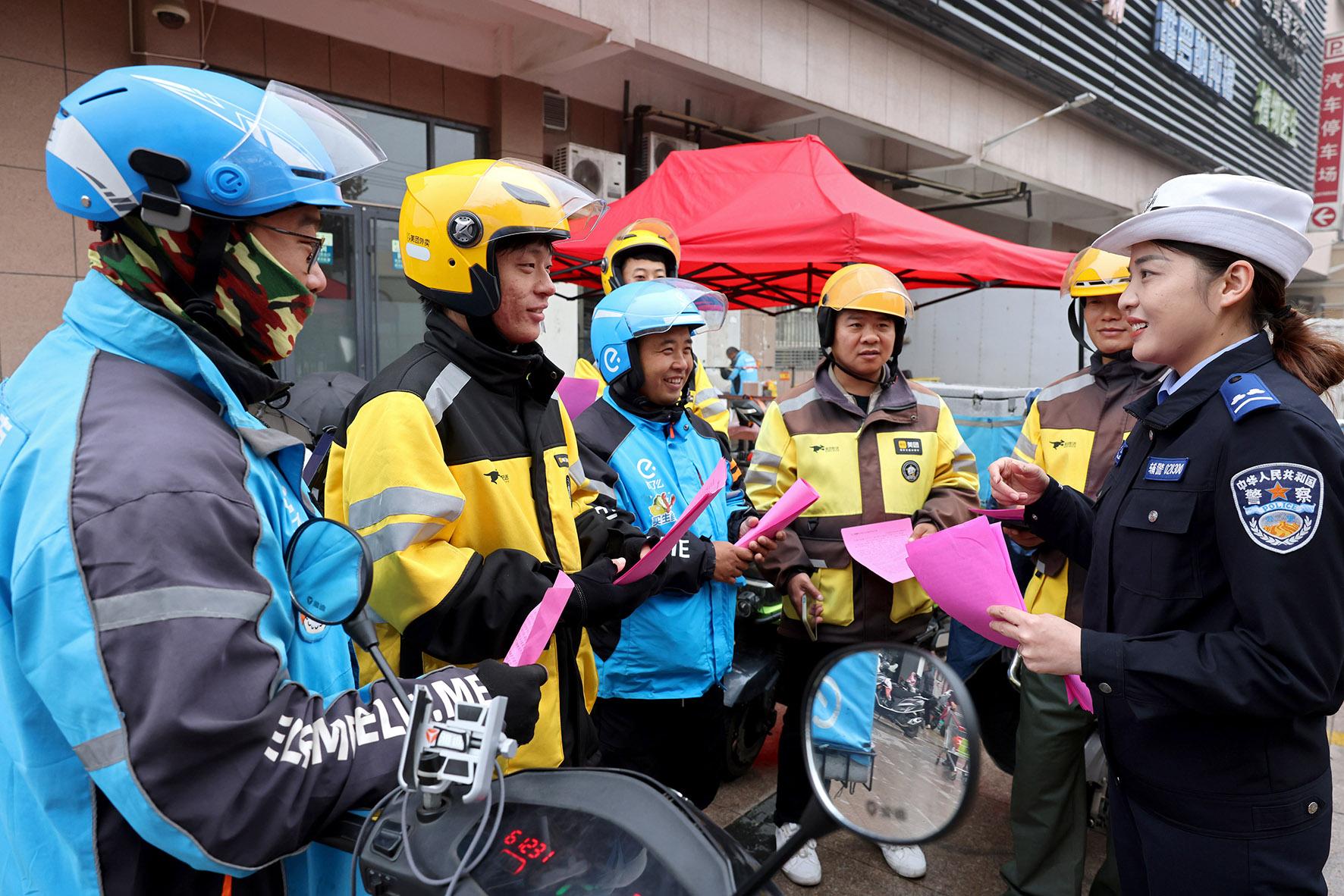 圖為11月14日,輔警為外賣配送員上交通安全課。