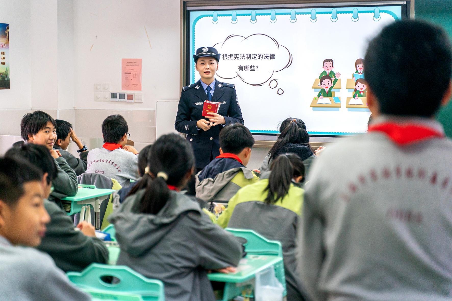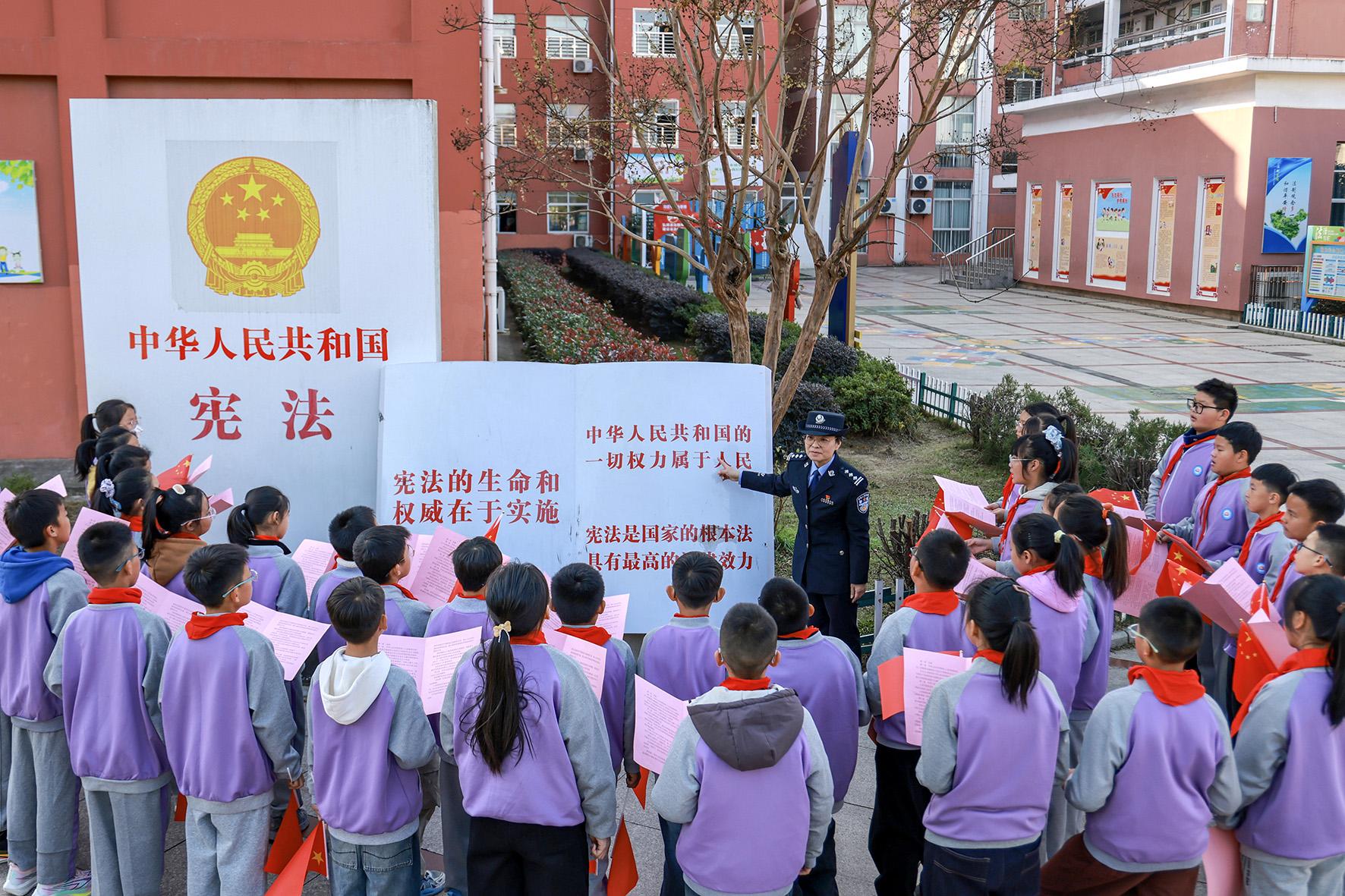 12月2日,安徽省廣德市公安局升平派出所社區(qū)民警來到桃州鎮(zhèn)第四小學為學生輔導學習憲法知識。