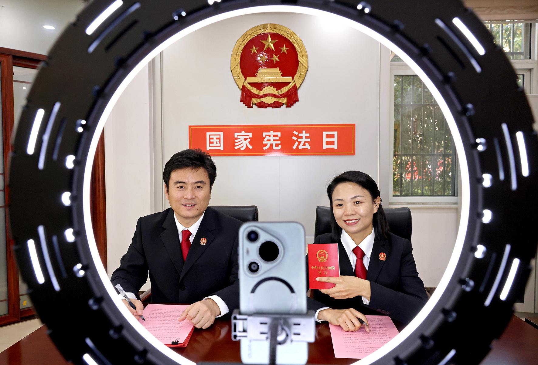 12月3日,山東省棗莊市市中區(qū)人民法院開展以“大力弘揚憲法精神 推動進一步全面深化改革”為主題的宣傳活動,兩名法官通過線上直播方式向觀眾宣傳憲法知識。