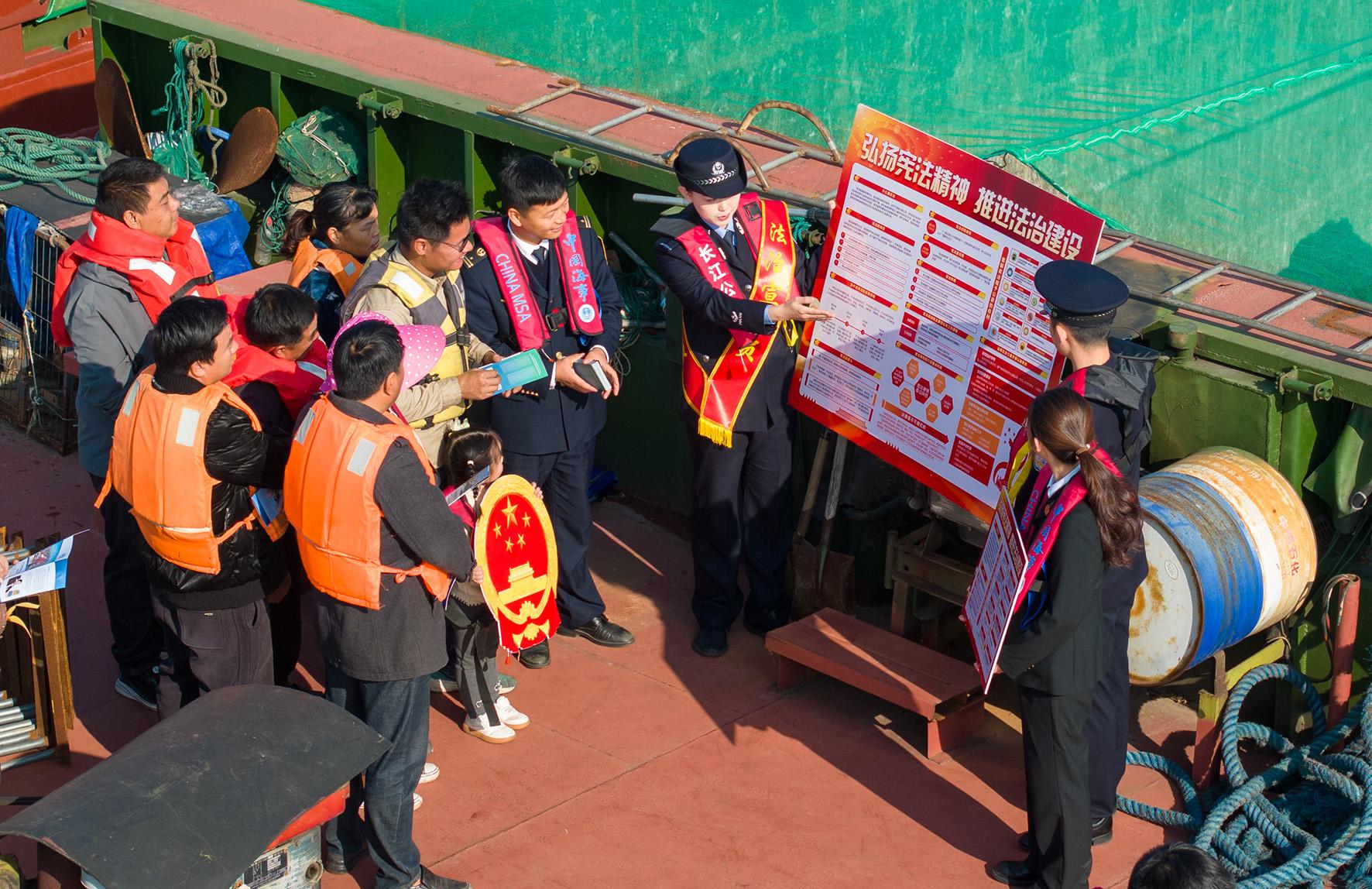 12月2日,長江航運公安局鎮(zhèn)江分局鎮(zhèn)江派出所聯(lián)合海事、法院等江蘇省鎮(zhèn)江市船員法律援助站成員單位,在長江江蘇鎮(zhèn)江段開展憲法上船頭活動。