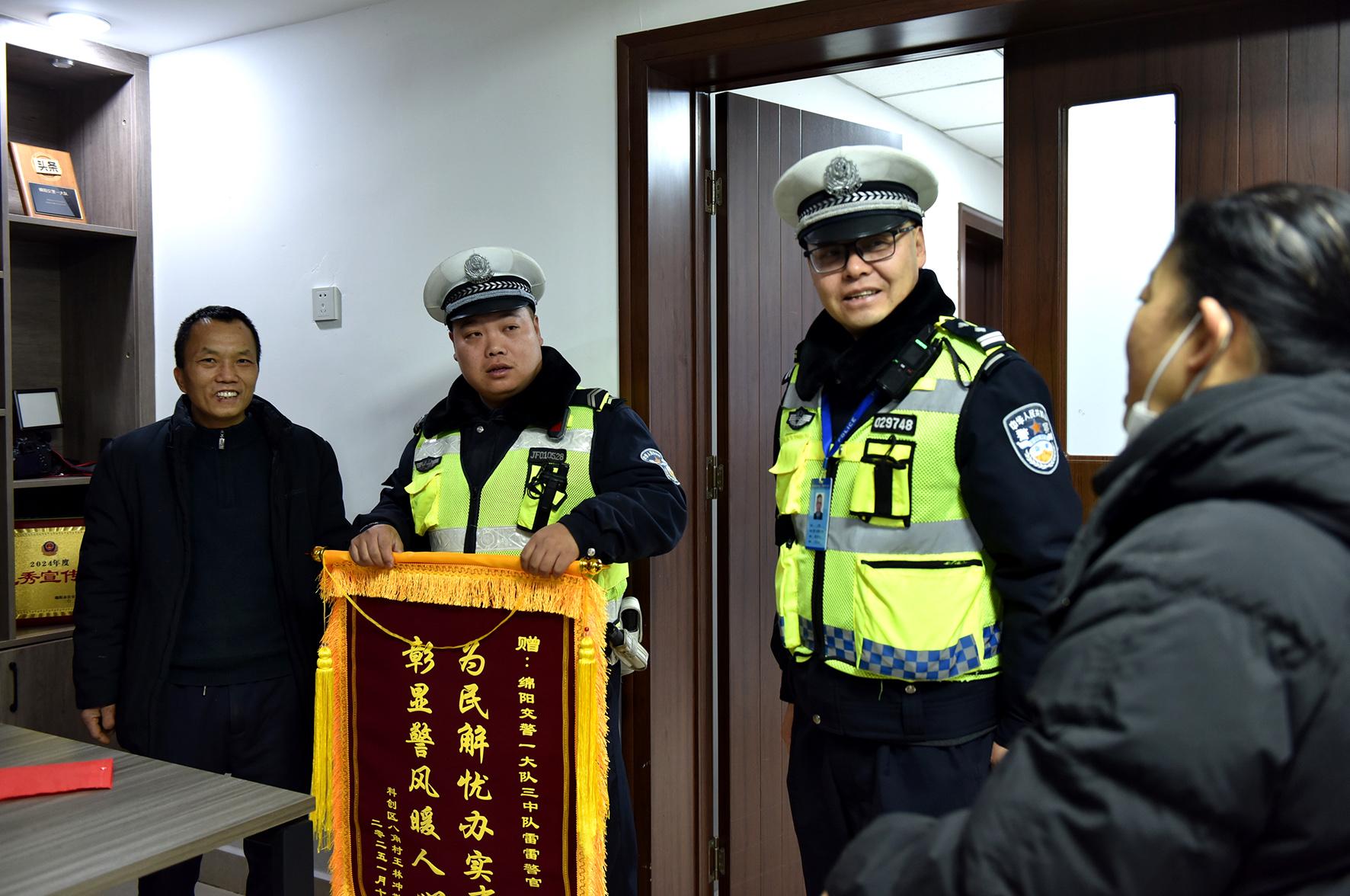 1月10日,第五個中國人民警察節(jié)。一對中年夫婦手拿錦旗走進了四川省綿陽市公安局交警支隊直屬一大隊,感謝民輔警巡邏時,將80多歲、迷路的父親安全送回家中。