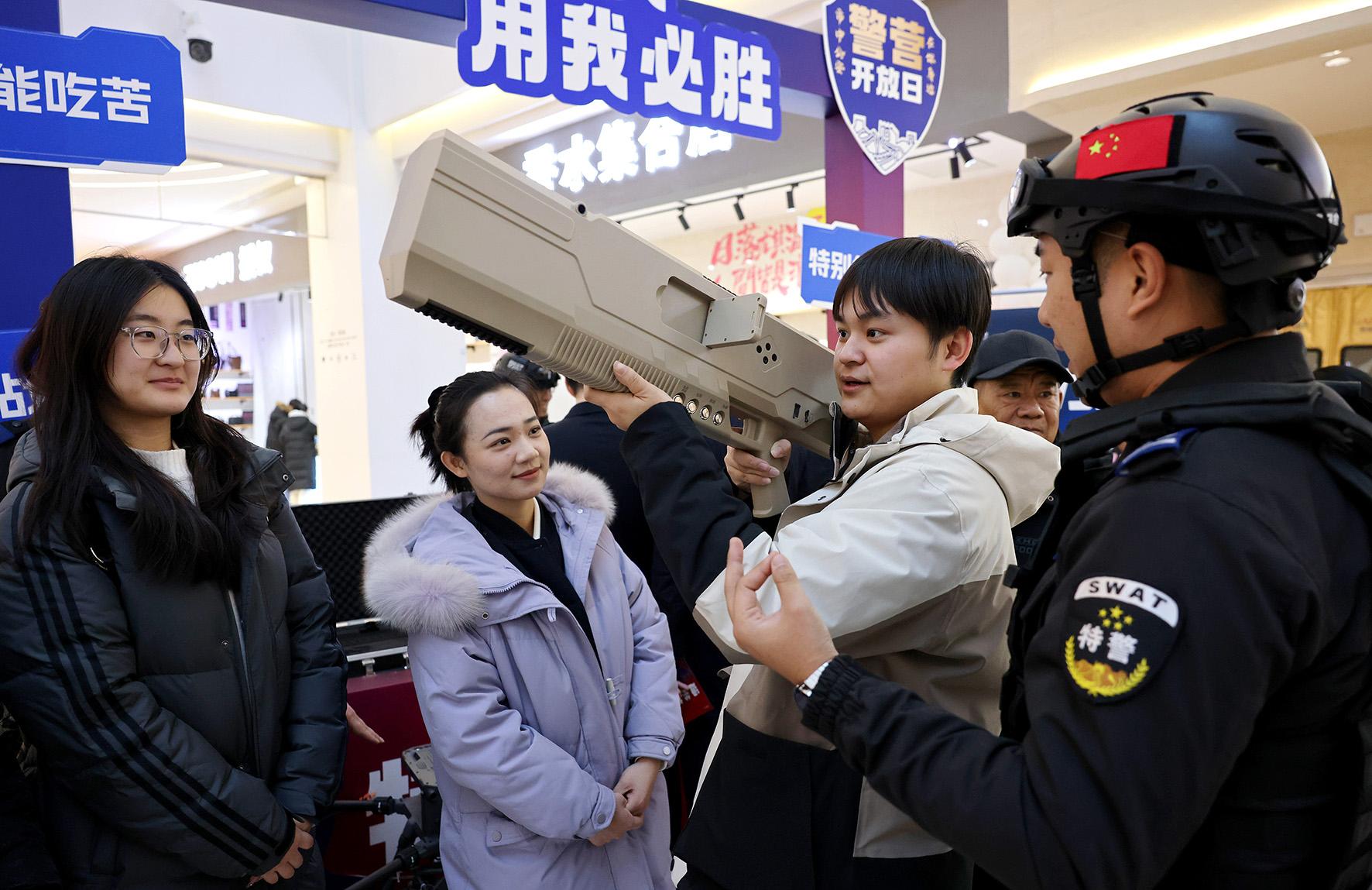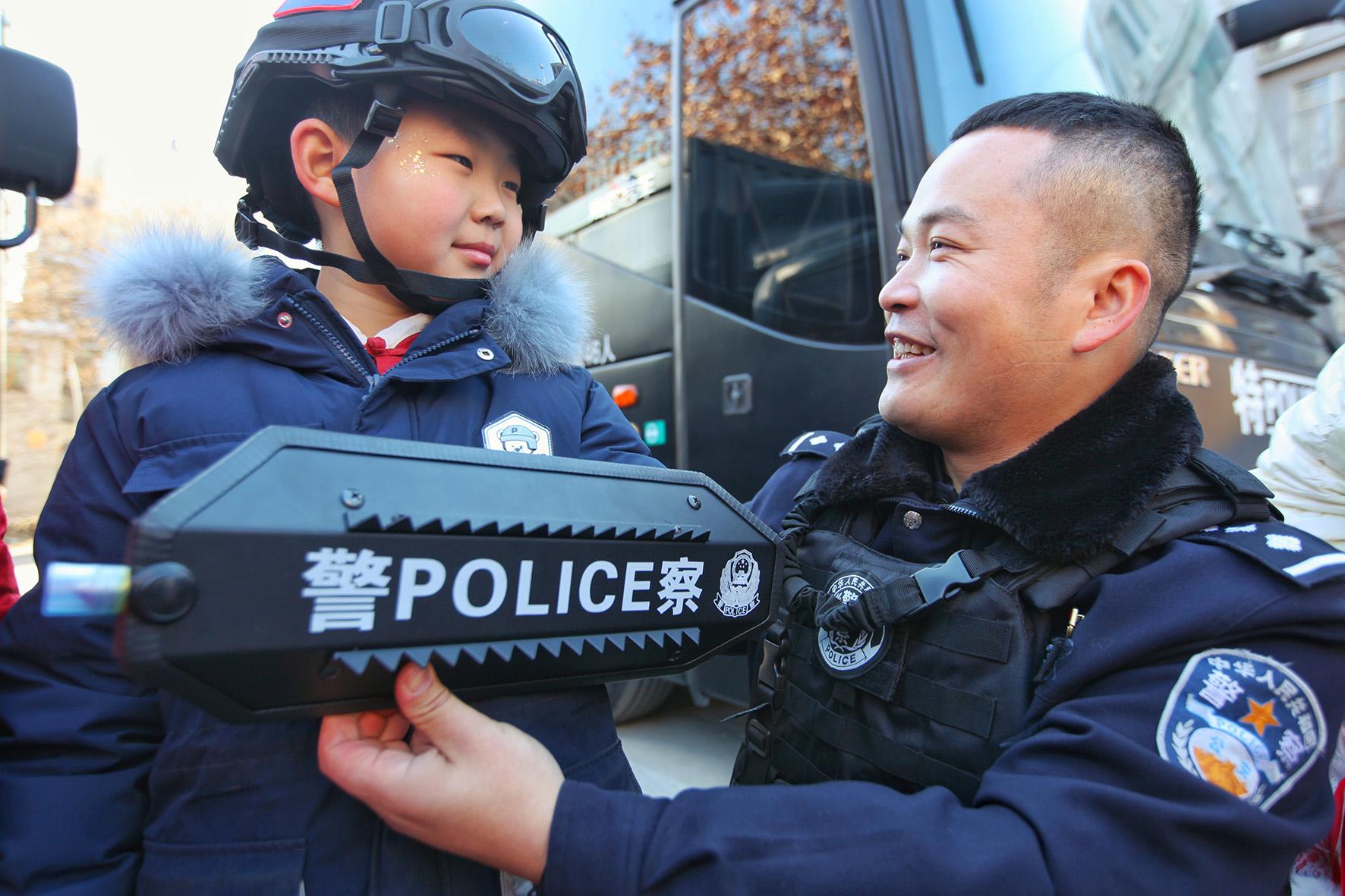 1月10日,第五個中國人民警察節(jié)。山東省棗莊市公安局警營開放日活動現(xiàn)場,市民在體驗警用裝備。
