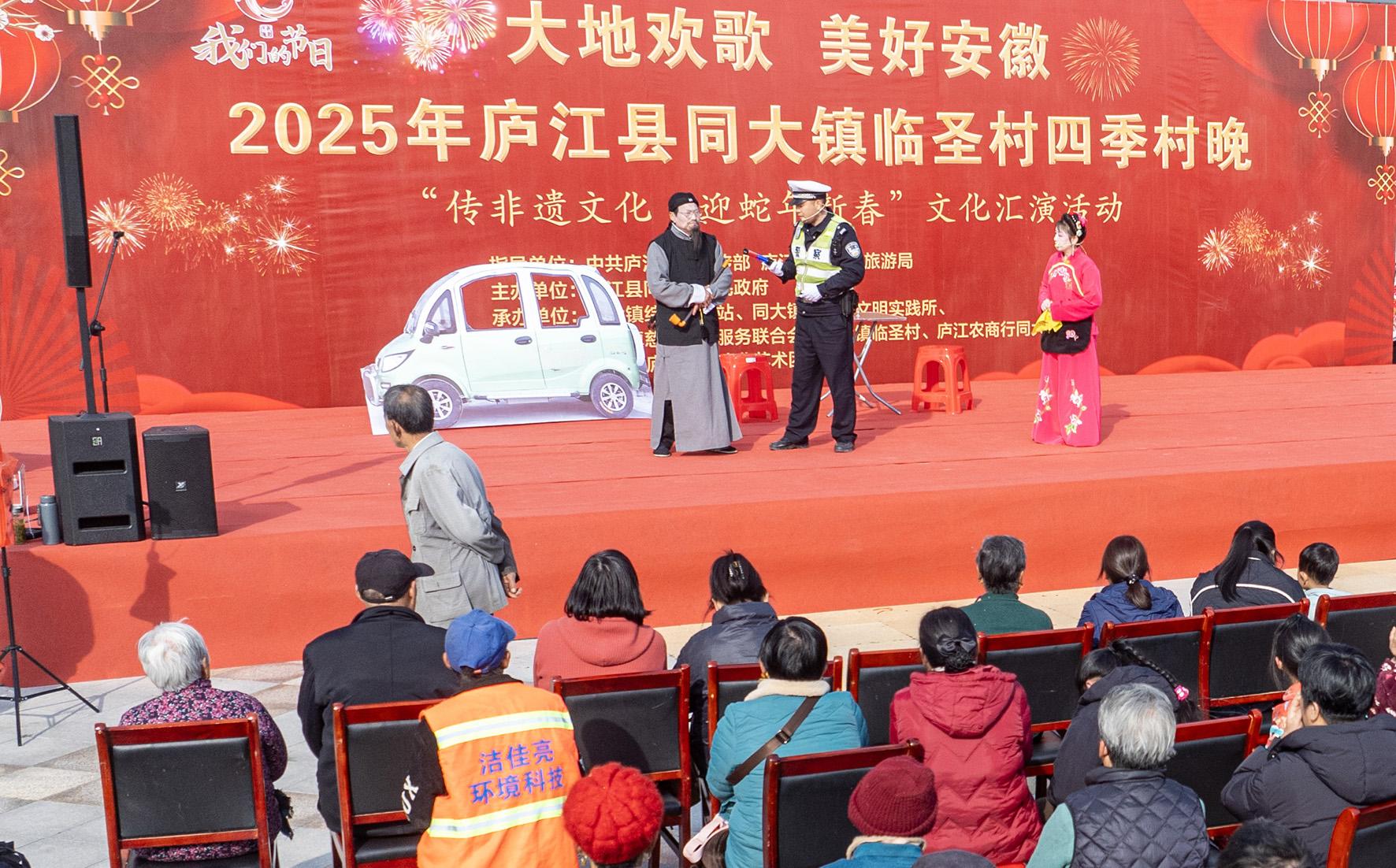 1月20日,安徽省合肥市廬江縣公安局交警大隊民警在同大鎮(zhèn)四季村晚活動現(xiàn)場,將交通安全知識植入到戲曲劇目,讓群眾在欣賞戲曲中學(xué)習(xí)交通法規(guī)。