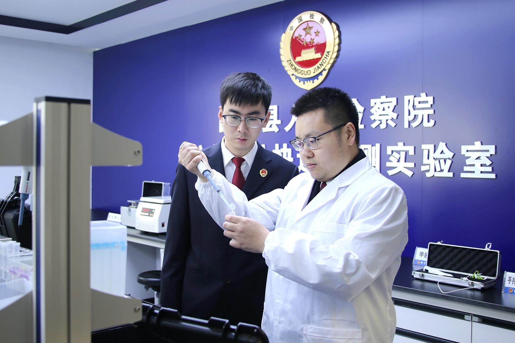 圖為辦案干警在公益訴訟快檢室對(duì)提取的污染物進(jìn)行檢測(cè)。