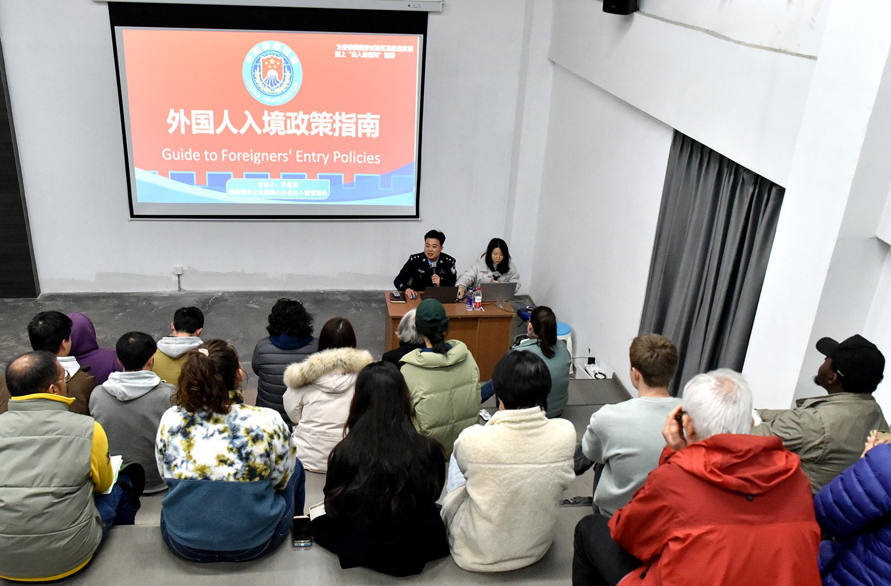 3月10日,在江西省景德鎮(zhèn)陶溪川國(guó)際陶藝工作室,景德鎮(zhèn)市公安局珠山分局出入境民警正在向外籍人士宣講240小時(shí)過(guò)境免簽政策。