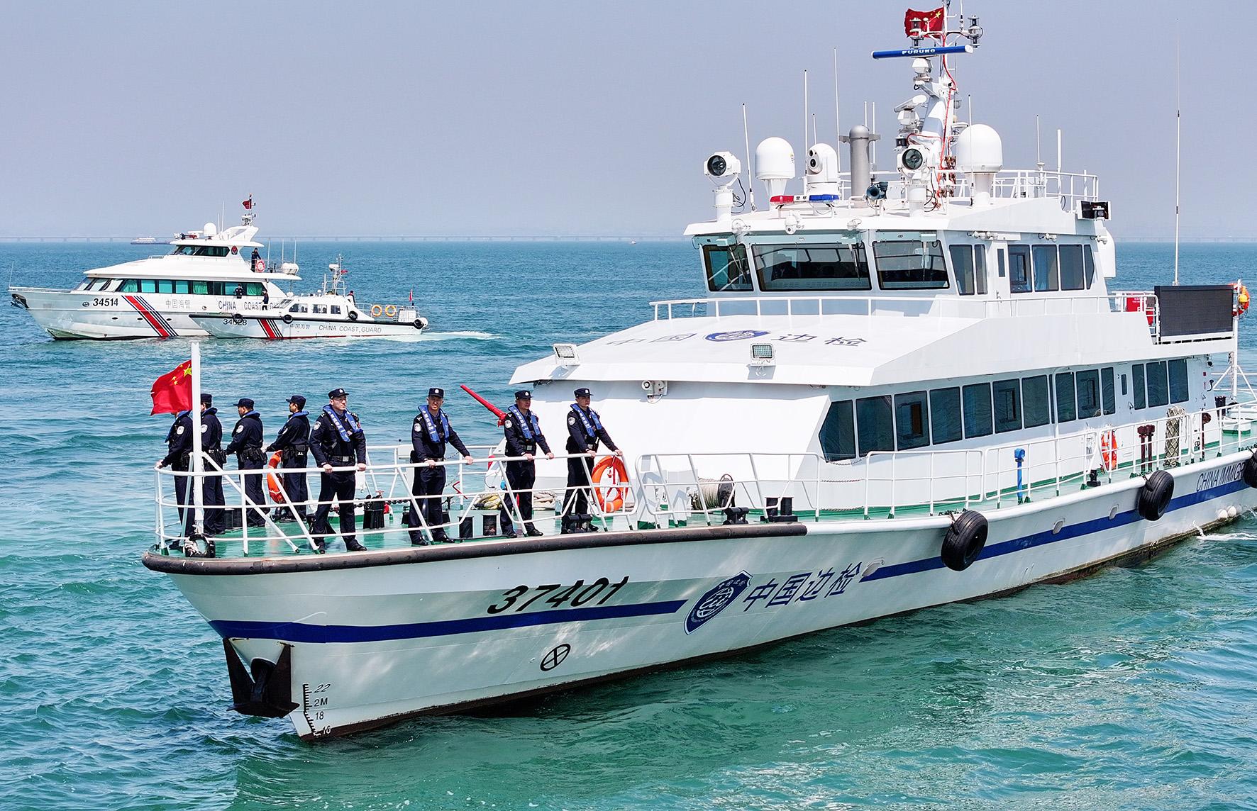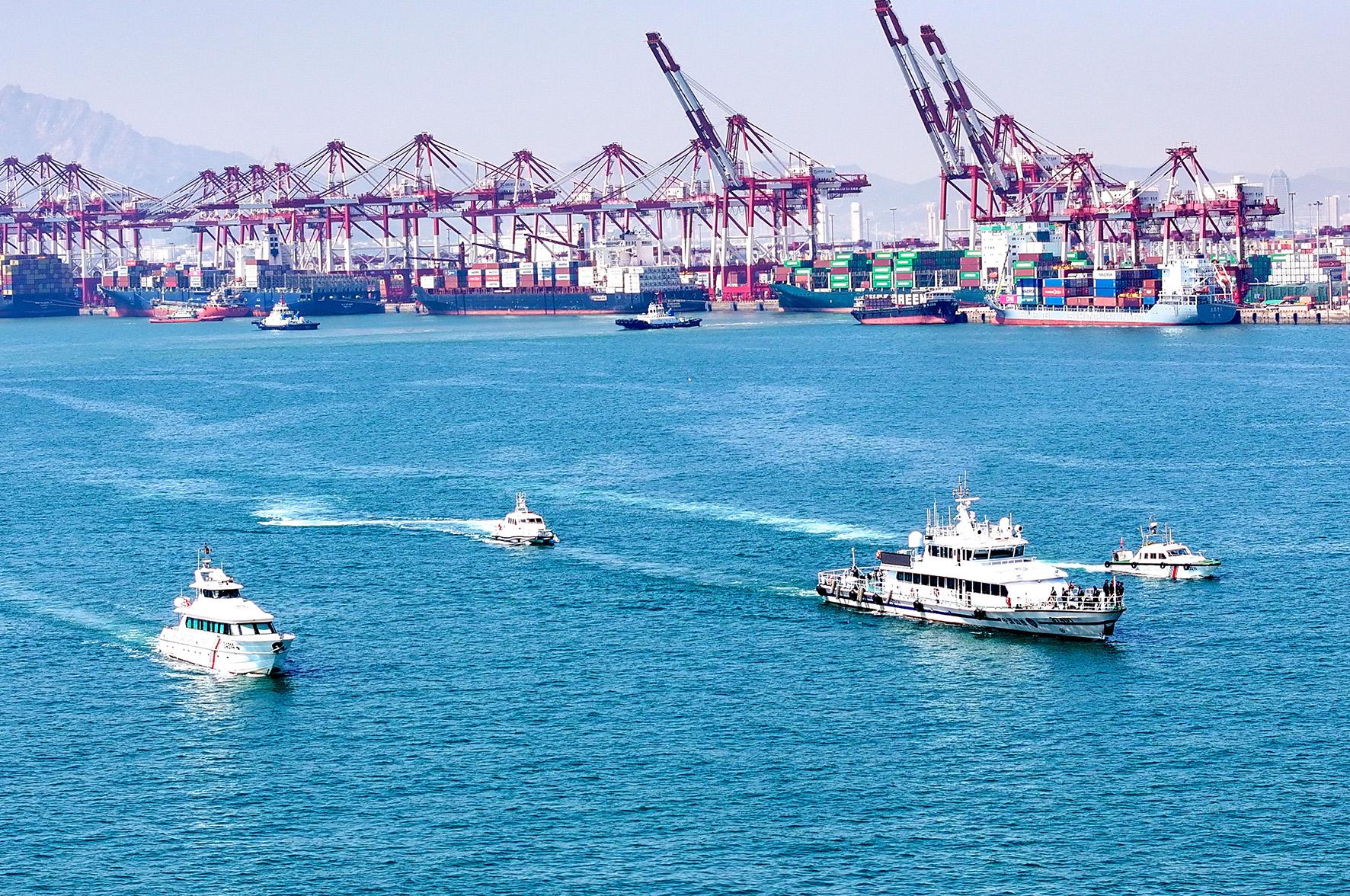 4月15日,山東青島開展“國門利劍2025”首次海陸空聯(lián)合執(zhí)法行動(dòng)。黃島邊檢站聯(lián)合海事、海警、港航公安等涉海部門,對(duì)青島港及周邊海域?qū)嵤┝Ⅲw巡查。