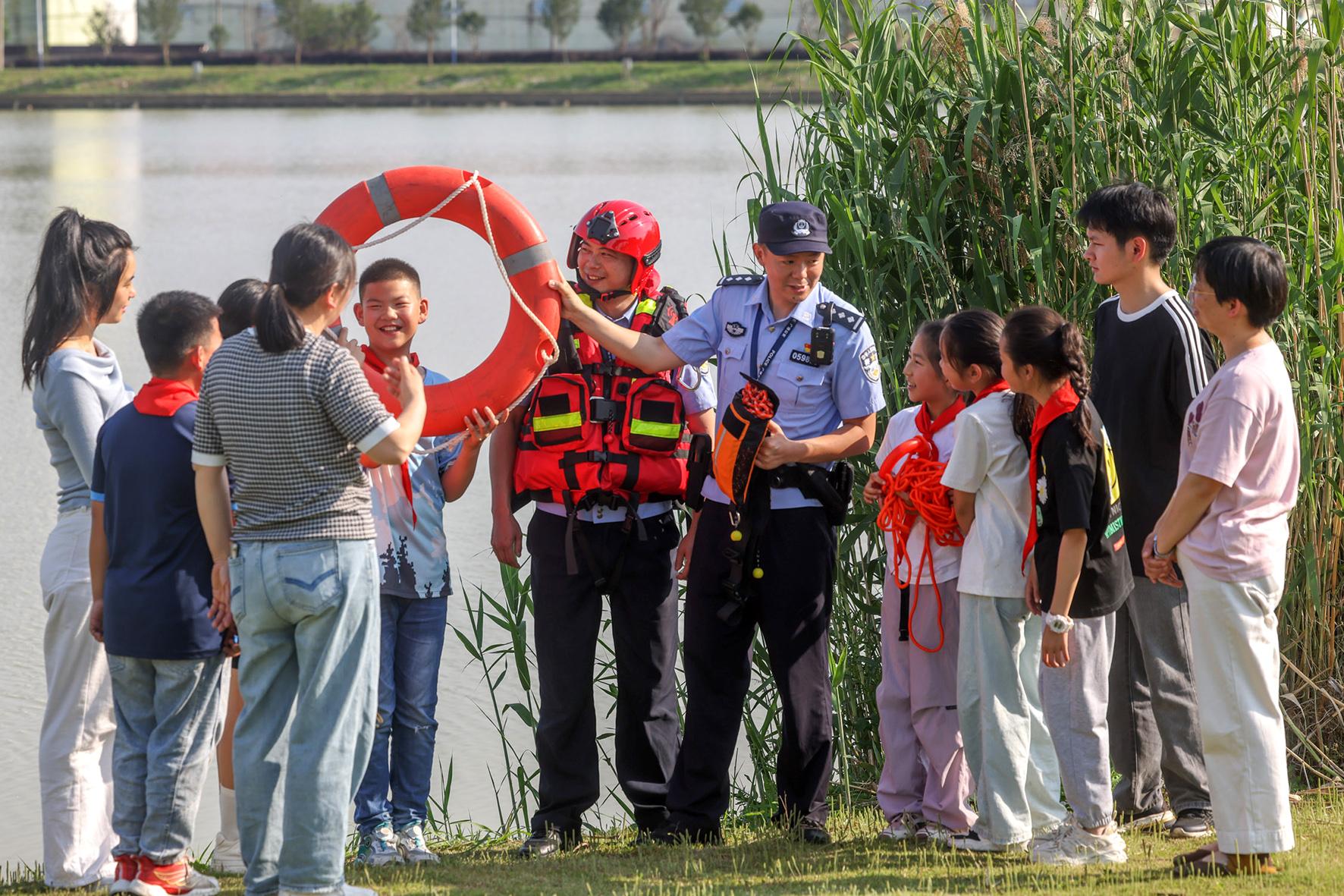 5月14日,安徽省廣德市公安局邱村派出所民警為師生講解防溺水和急救知識(shí)。