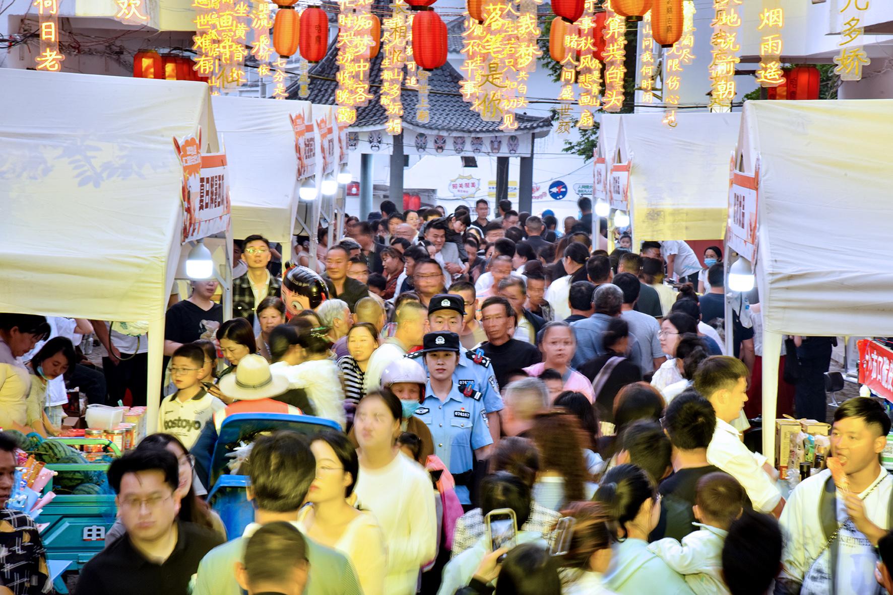 5月24日,安徽省馬鞍山市含山縣公安局民警在昭關(guān)古街龍蝦宴現(xiàn)場巡邏執(zhí)勤。