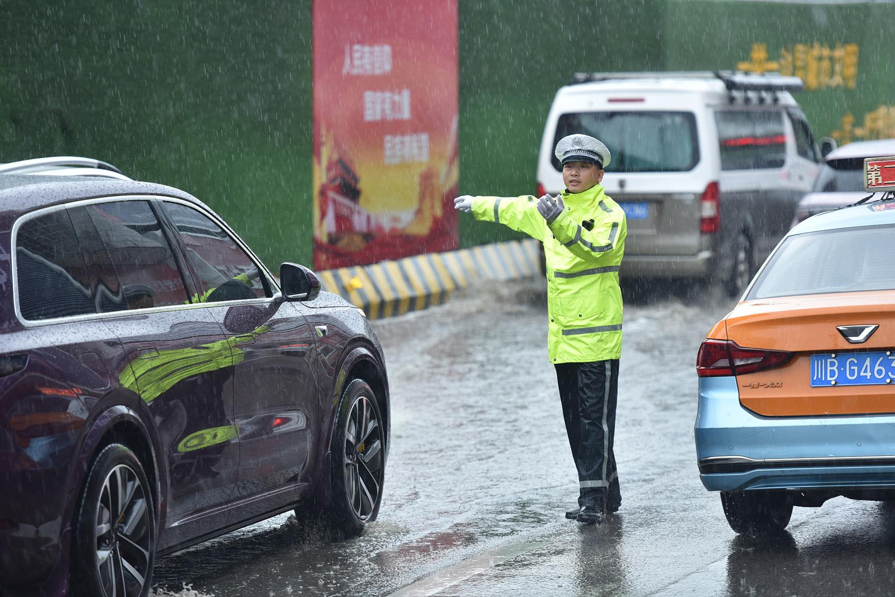 5月27日,四川綿陽(yáng)遭遇強(qiáng)降雨天氣。綿陽(yáng)市公安局交警支隊(duì)直屬一大隊(duì)民輔警提前上崗,在復(fù)雜路口、路段指揮疏導(dǎo)車輛,確保道路安全暢通。
