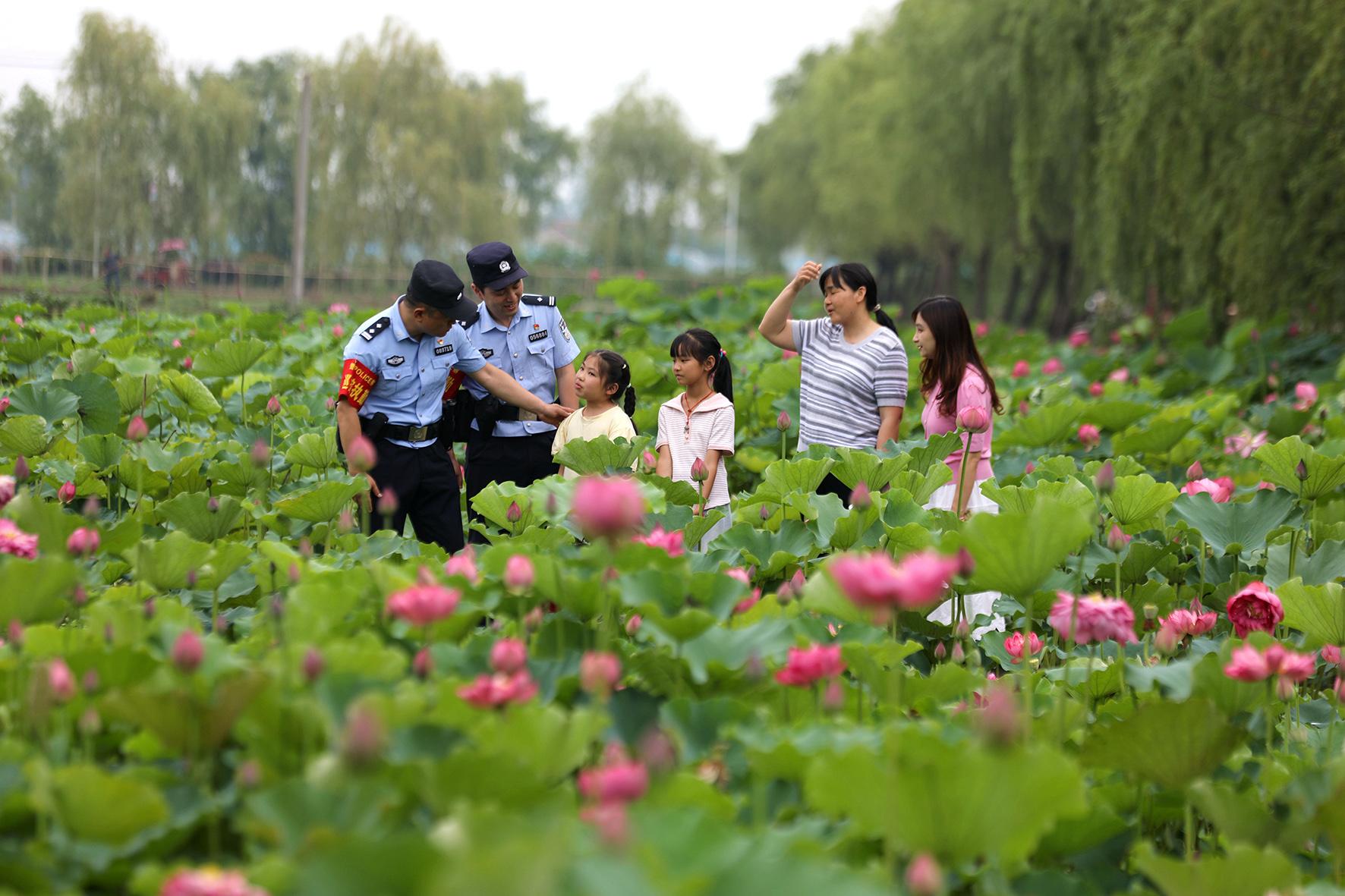 6月9日,安徽省舒城縣棠樹鄉(xiāng)數(shù)百畝荷花迎來盛開季。舒城縣公安局棠樹派出所推出“護(hù)游警務(wù)”,積極開展巡邏防控、服務(wù)等工作,為游客排憂解難。