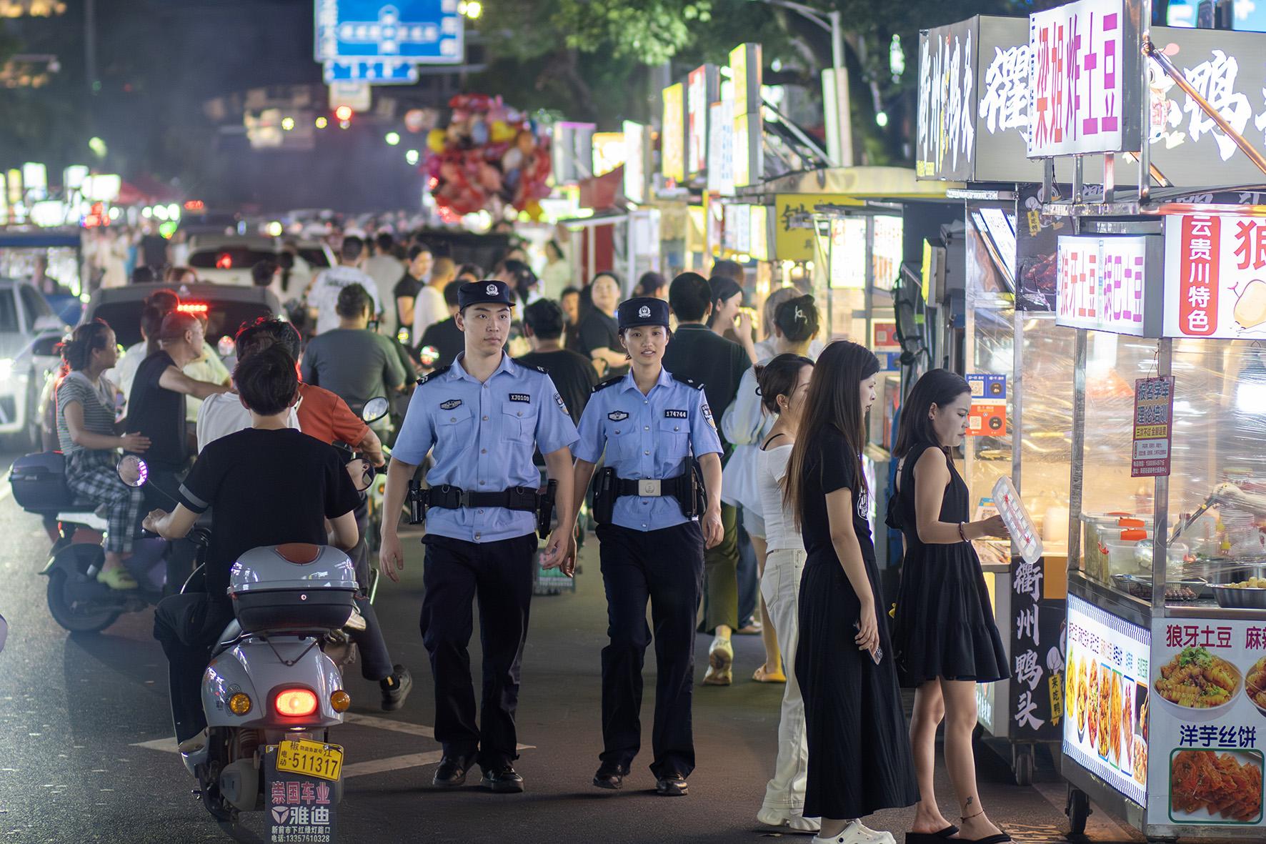 6月30日夜,浙江省臺州市公安局黃巖分局新前派出所民警輔警在西范夜市巡邏。入夏以來,臺州市公安局黃巖分局積極部署對城鄉(xiāng)夜市的巡邏防控,提升見警率,守護民間“煙火氣”,助力“夜經濟”發(fā)展。